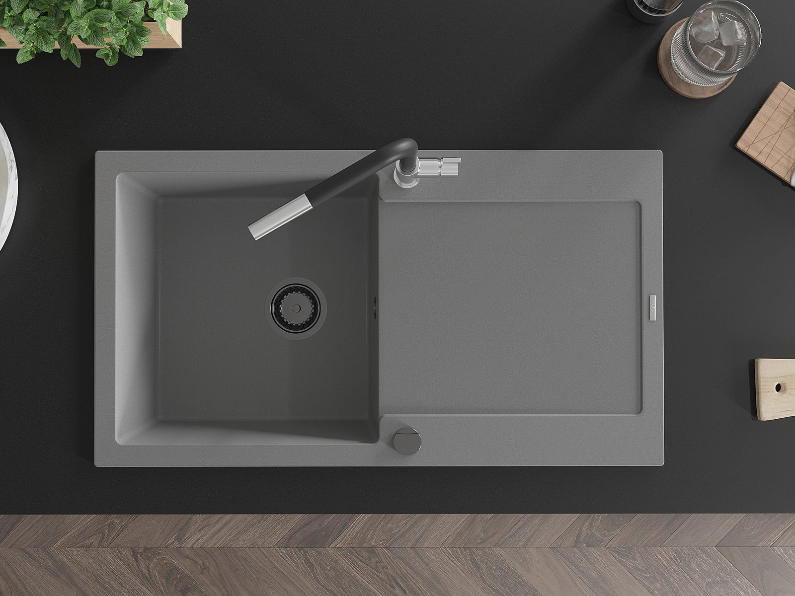 Povrch kuchynského drezu je odolný voči škvrnám a zafarbeniu, vďaka čomu sa ľahko udržiava a zachováva svoju farbu počas dlhého obdobia používania. Estetický a praktický doplnok pre každú kuchyňu.