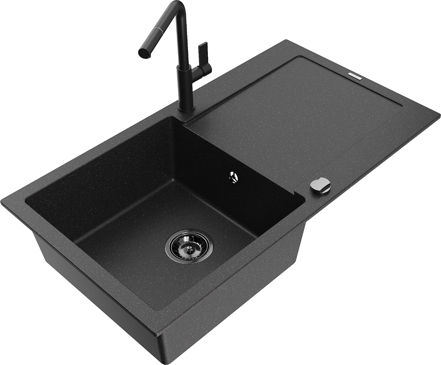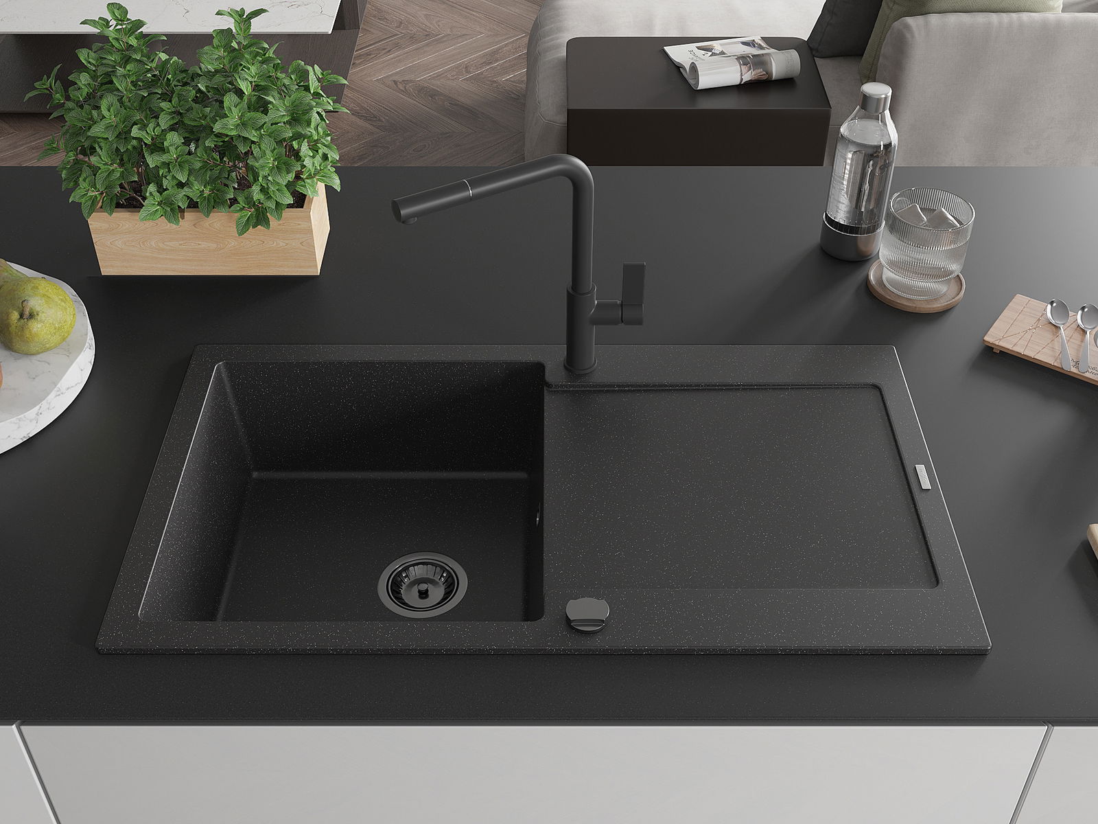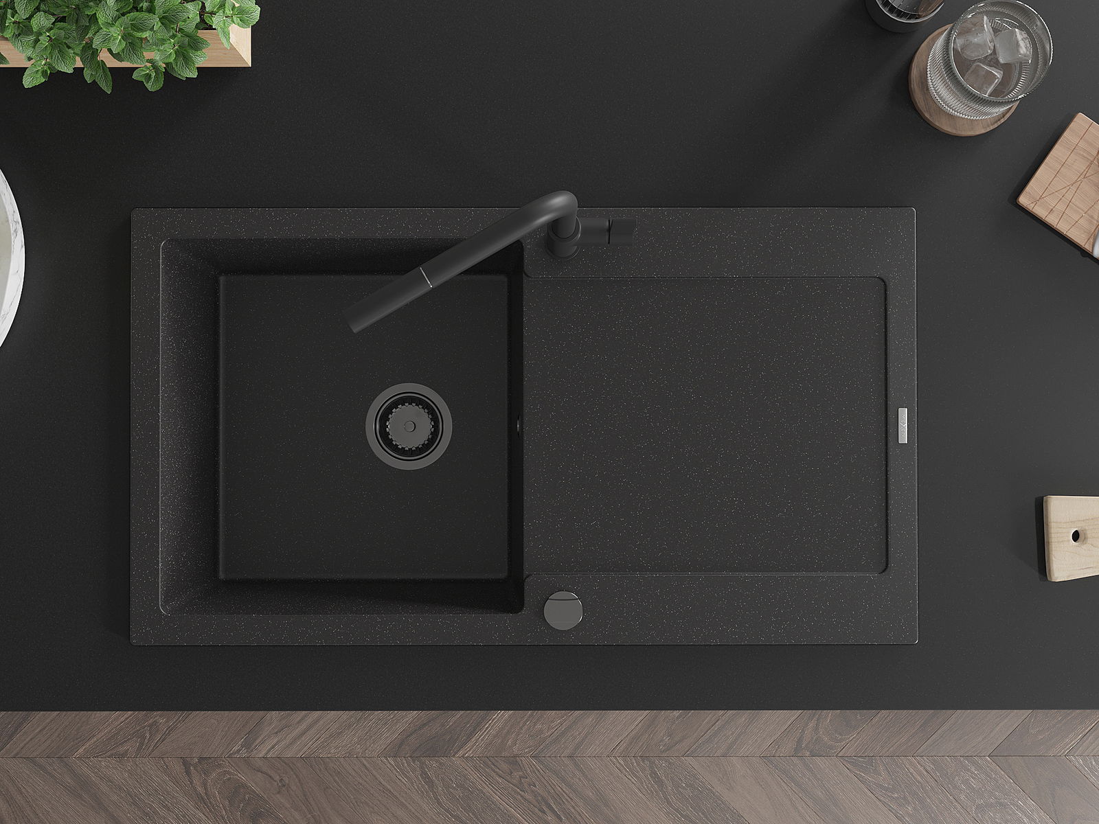 Mexen Leo žulový drez s jednou komorou s odkvapkávačom a kuchynskou batériou Flora, čierny/strieborný metalický