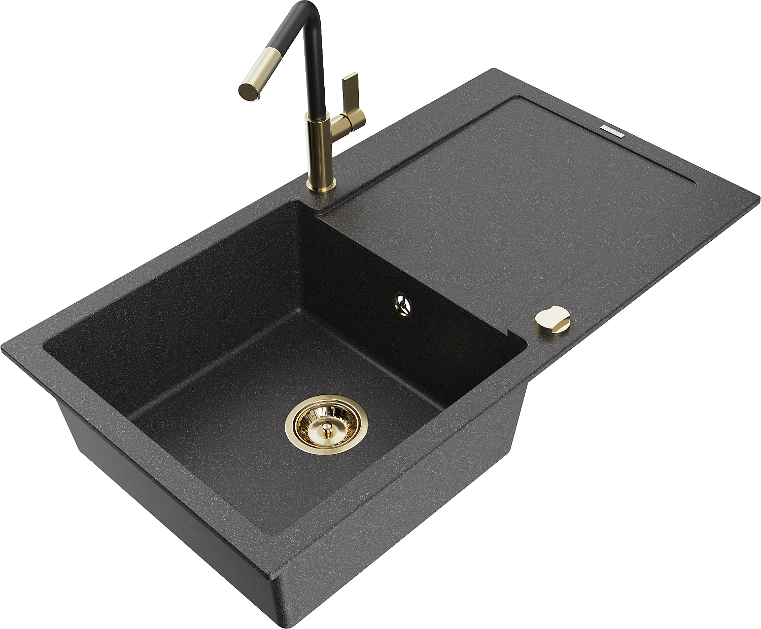 Mexen Leo granitový drez 1-komorový s odkvapkávačom a kuchynskou batériou Flora, čierny škvrnitý - 6501-76-670401-57-G