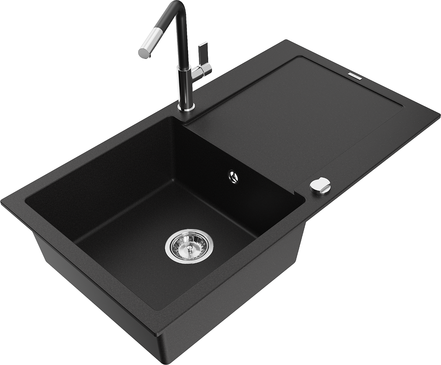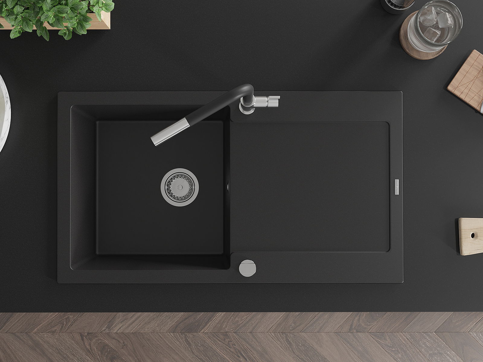 Mexen Leo žulový drez s 1 komorou a odkvapkávačom a kuchynskou batériou Flora, čierny - 6501-77-670401-07