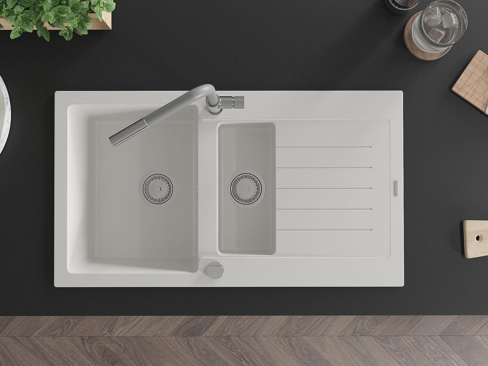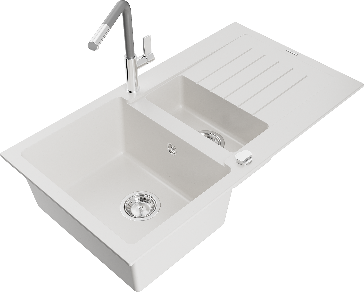 Mexen Matias granitový drez 1,5-komorový s odkvapkávačom a kuchynskou batériou Flora, biely - 6502-20-670401-06