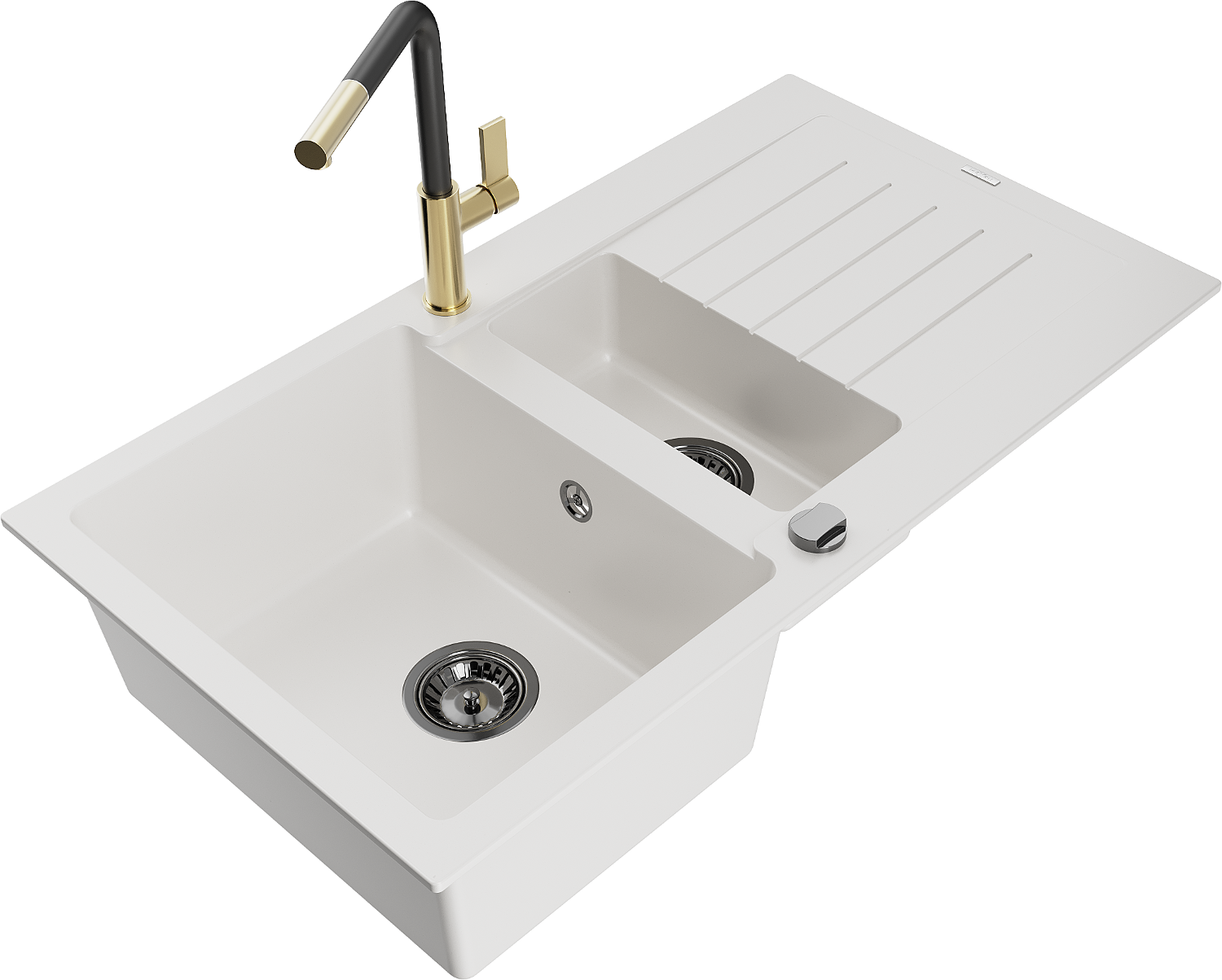 Mexen Matias granitový drez 1,5-komorový s odkvapkávačom a kuchynskou batériou Flora, biely - 6502-20-670401-57-B