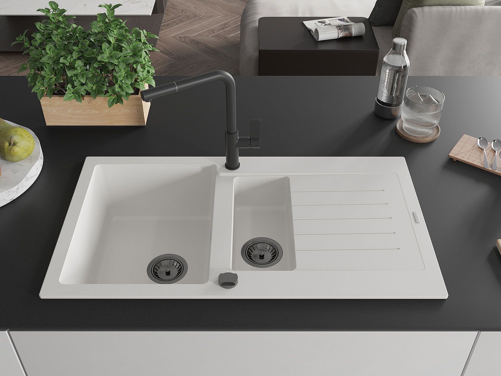 Povrch umývadla je odolný voči škvrnám a sfarbeniu, vďaka čomu sa ľahko čistí a zachováva si svoju farbu po dlhú dobu. Estetický a prakticky dopĺňajúci každú kuchyňu.