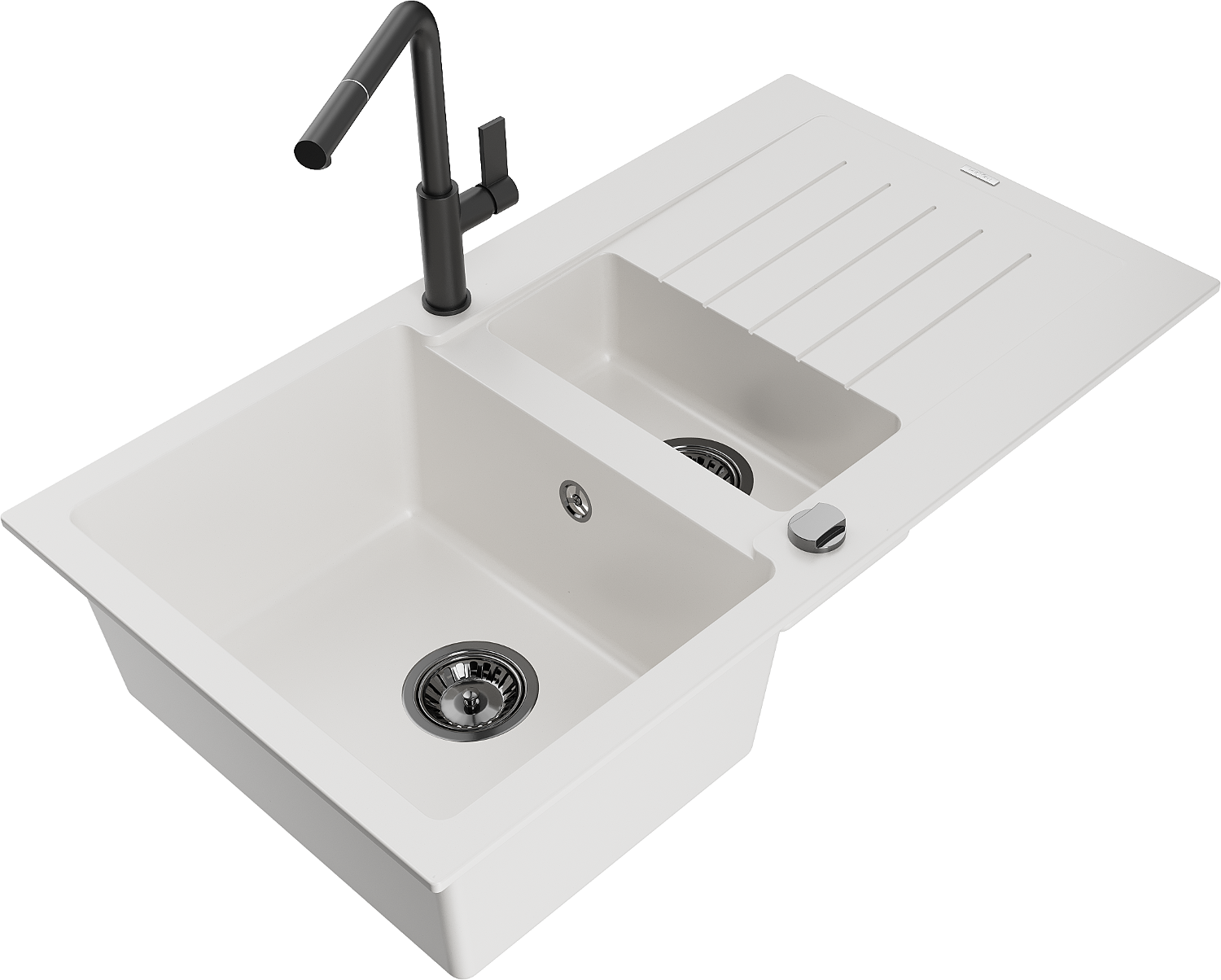 Mexen Matias granitový drez 1,5-komorový s odkvapkávačom a kuchynskou batériou Flora, biely - 6502-20-670401-70-B
