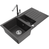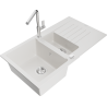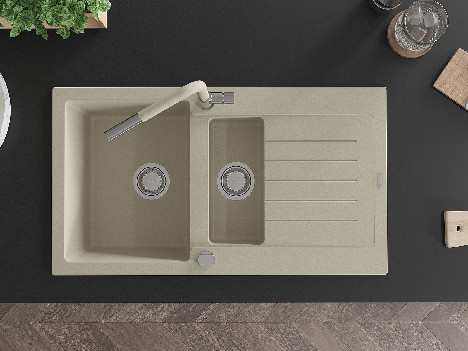 Mexen Matias granitový drez 1,5-komorový s odkvapkávačom a kuchynskou batériou Flora, béžový - 6502-69-670401-09