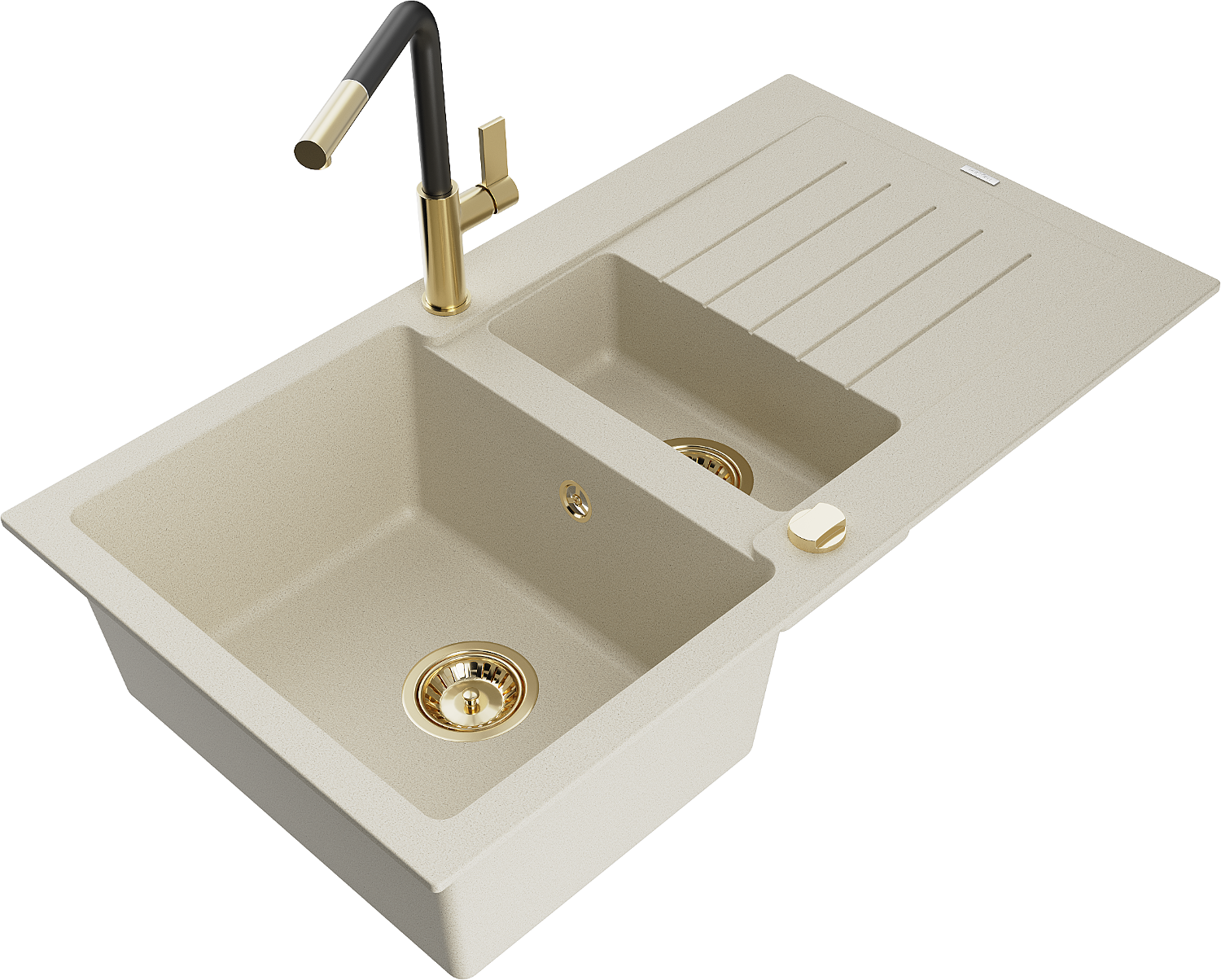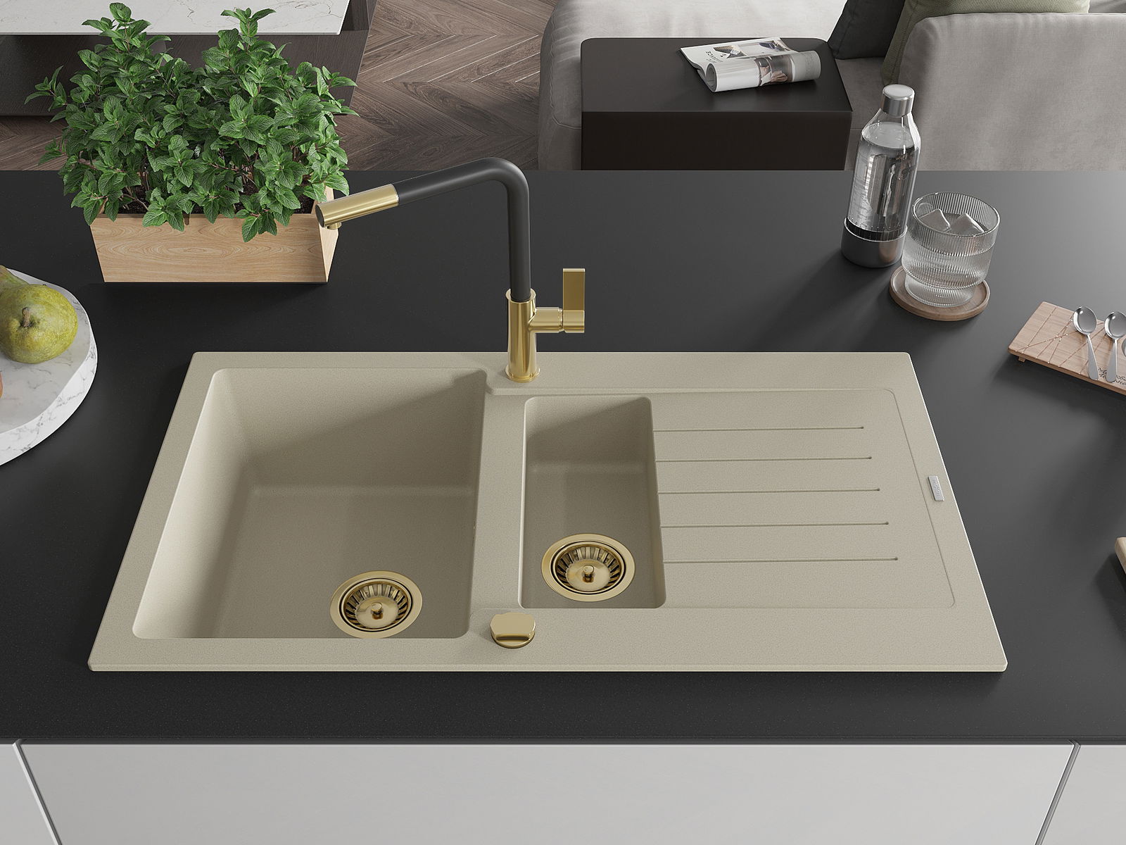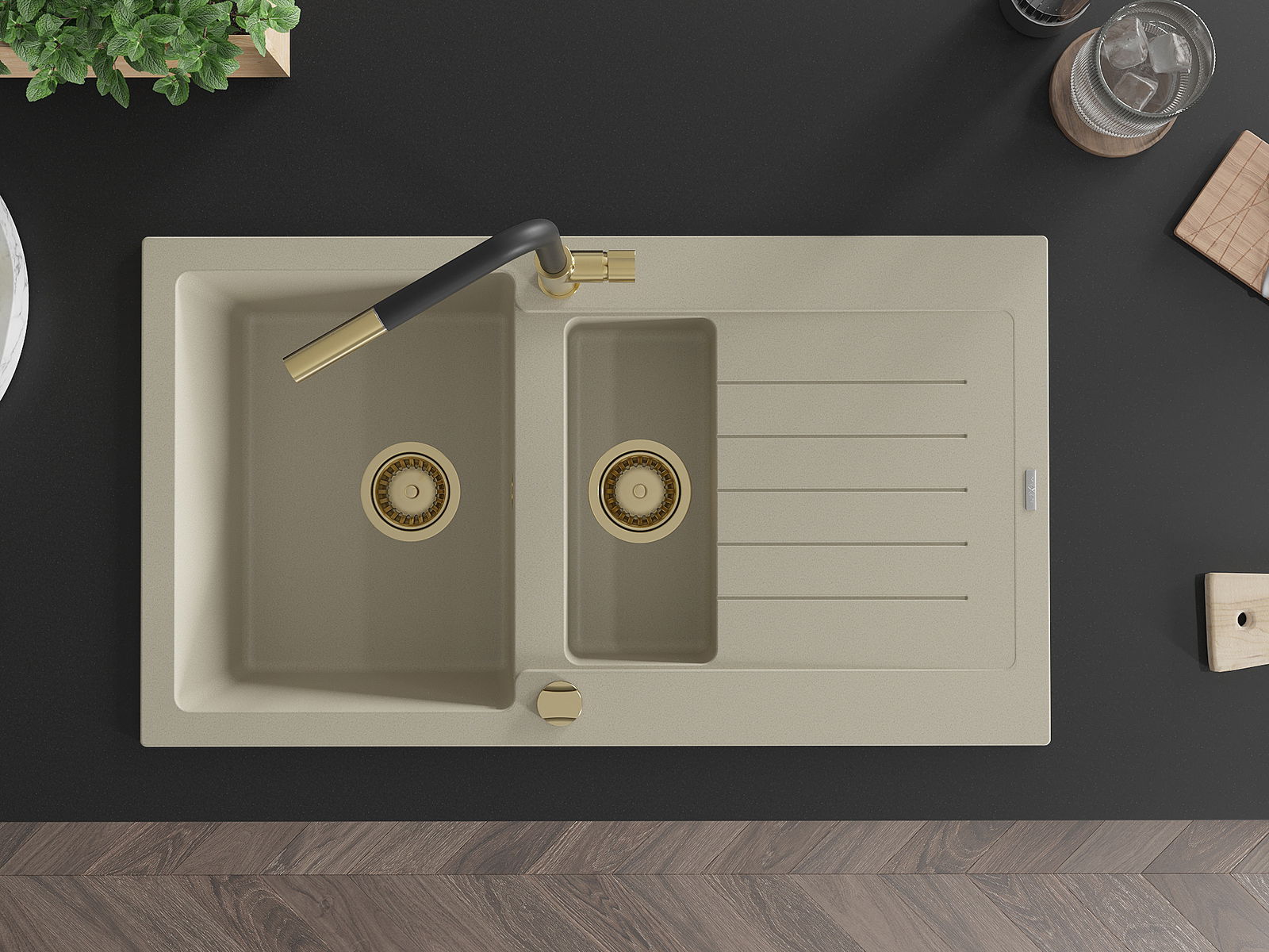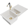 Mexen Matias granitový drez 1,5-komorový s odkvapkávačom a kuchynskou batériou Flora, béžový - 6502-69-670401-57-G