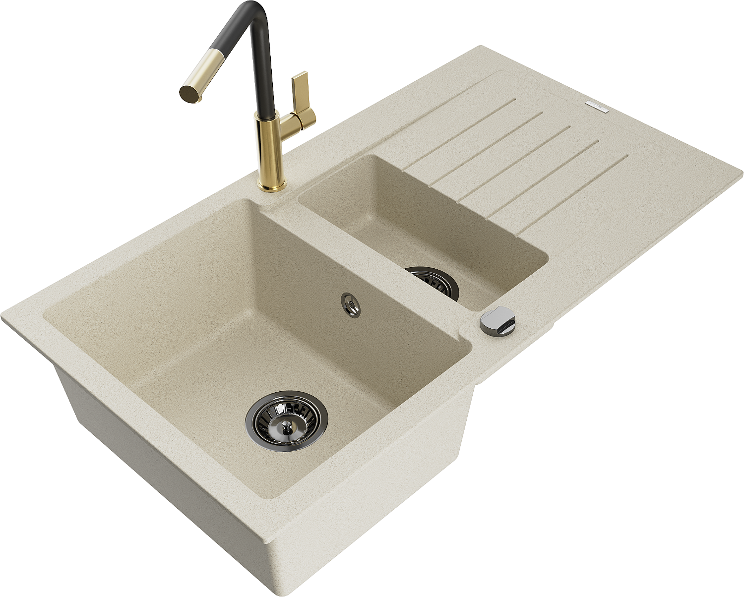 Mexen Matias žulový drez s 1,5 komorou s odkvapkávačom a kuchynskou batériou Flora, béžový - 6502-69-670401-57-B