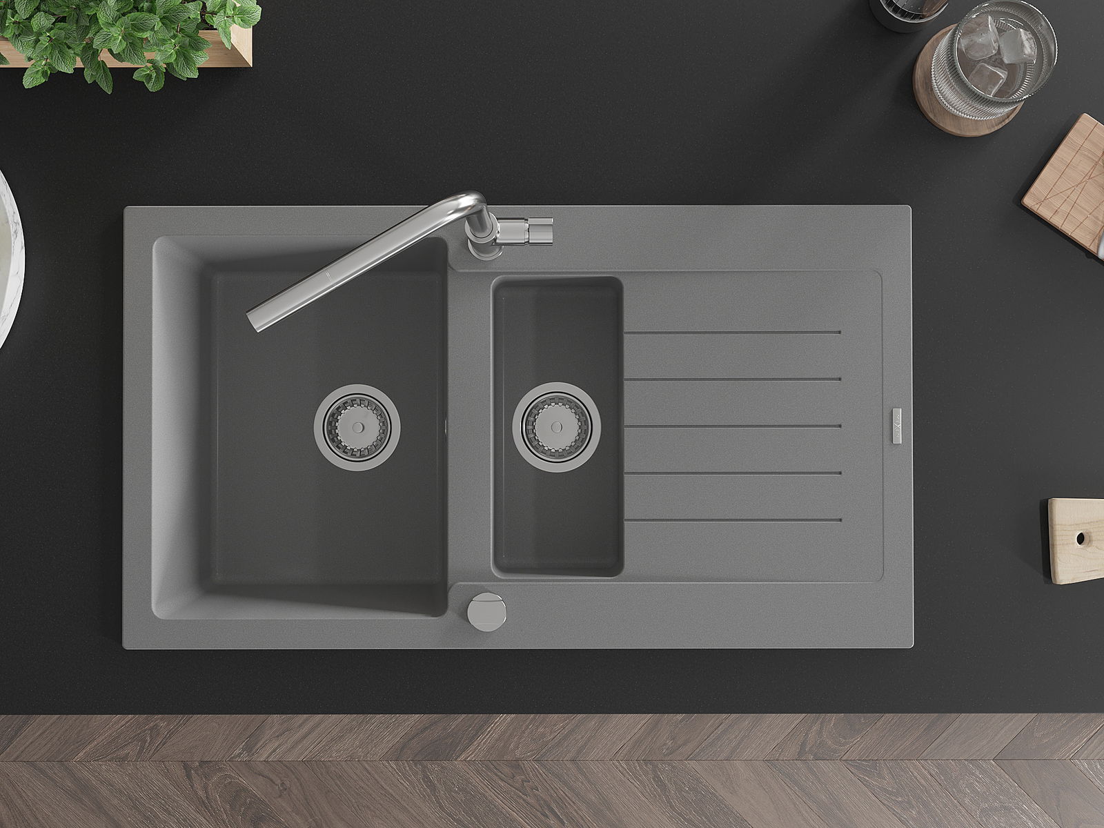 Mexen Matias 1,5-komorový granitový drez s odkvapkávačom a kuchynskou batériou Flora, sivý - 6502-71-670401-00