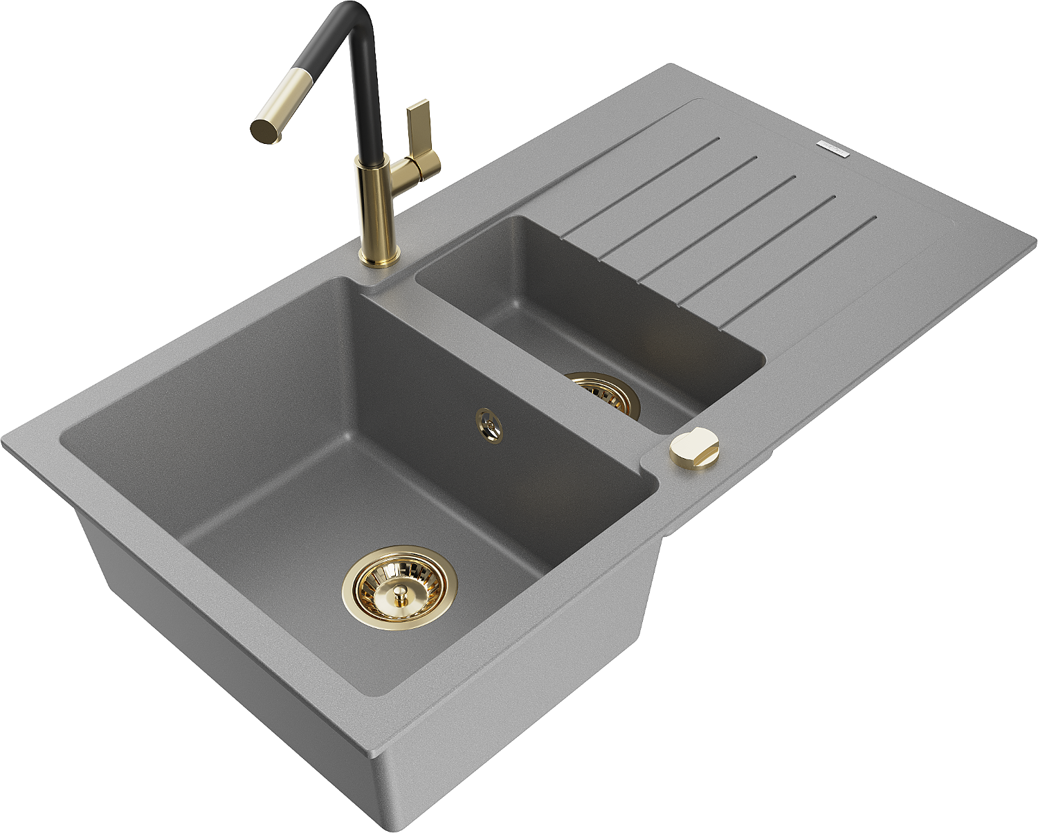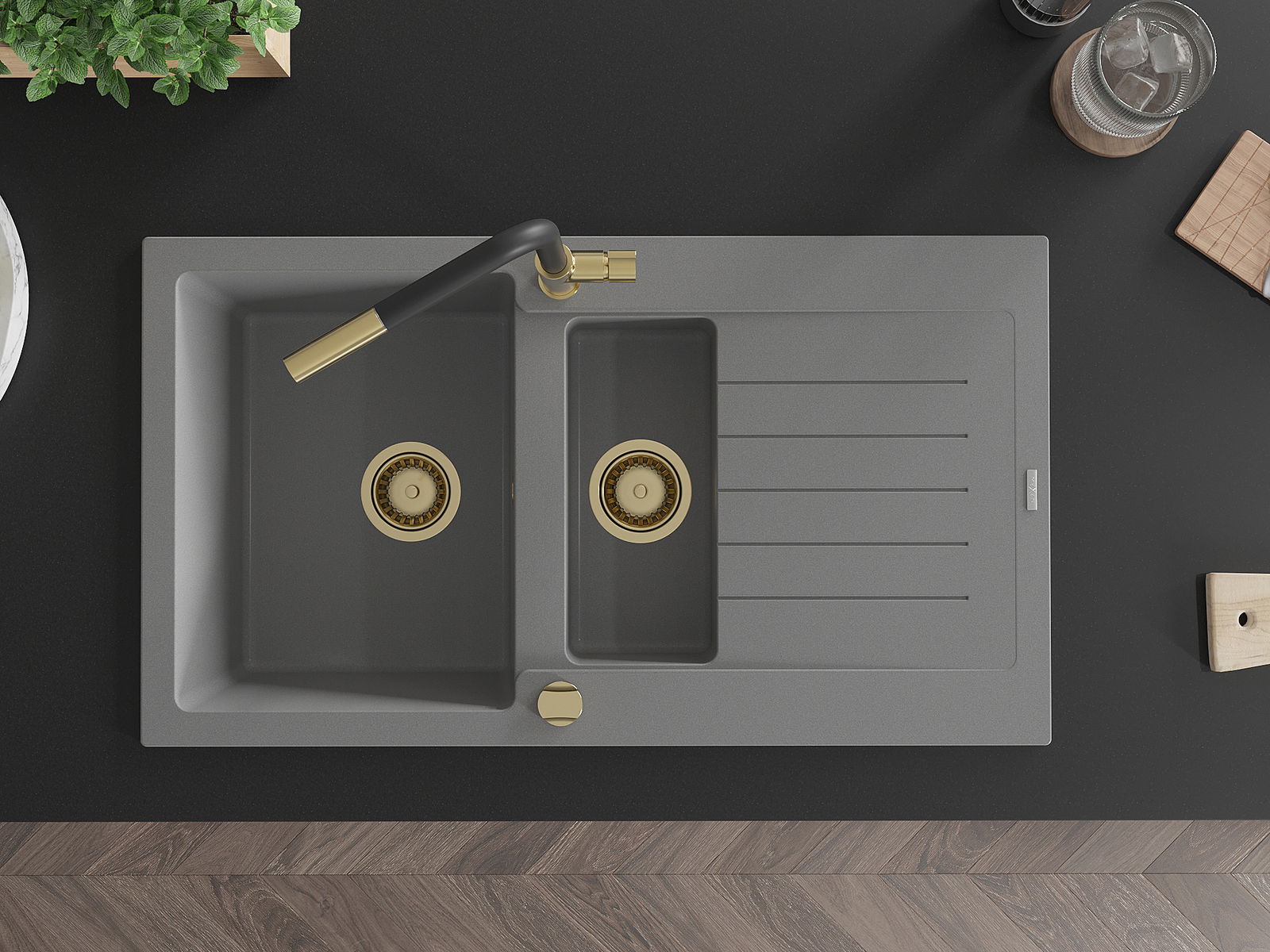Mexen Matias granitový drez s odkvapkávačom a kuchynskou batériou Flora, šedý - 6502-71-670401-57-G