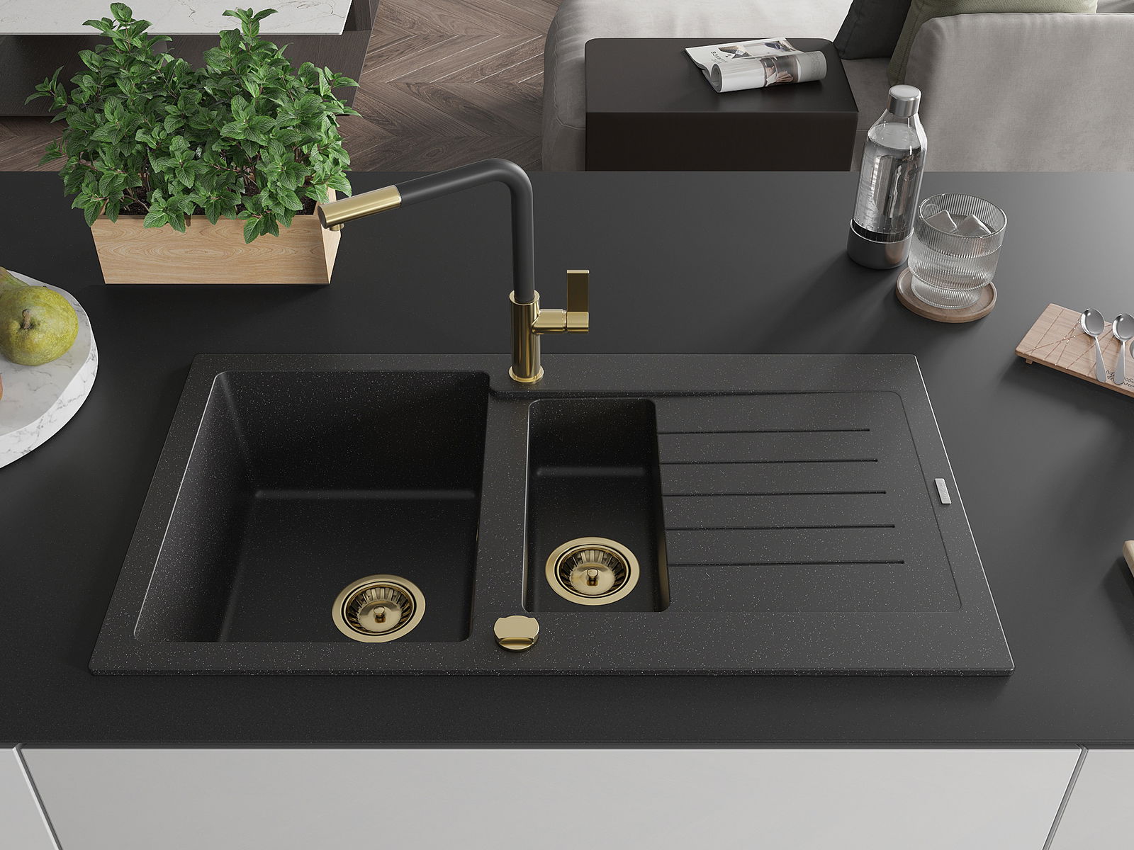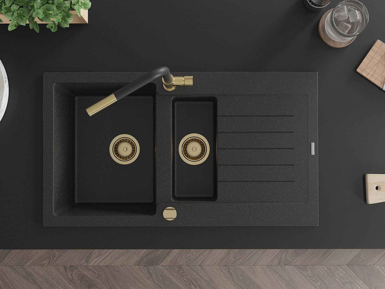 Drez má 2 predfrézované otvory s priemerom 35 mm, ktoré si môžete vlastnoručne vyraziť. Môžete ich využiť napríklad na montáž dávkovača na tekutinu, ktorý eliminuje prítomnosť plastových fliaš v kuchyni a dodá jej elegantný vzhľad.