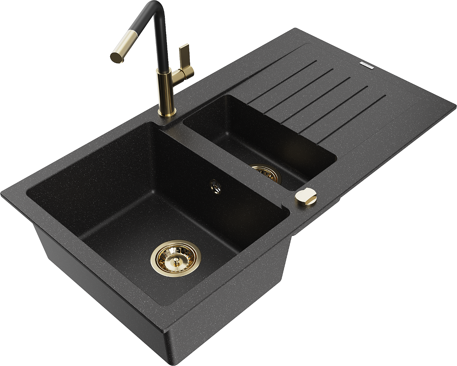 Mexen Matias granitový drez 1,5-komorový s odkvapkávačom a kuchynskou batériou Flora, čierny/strieborný