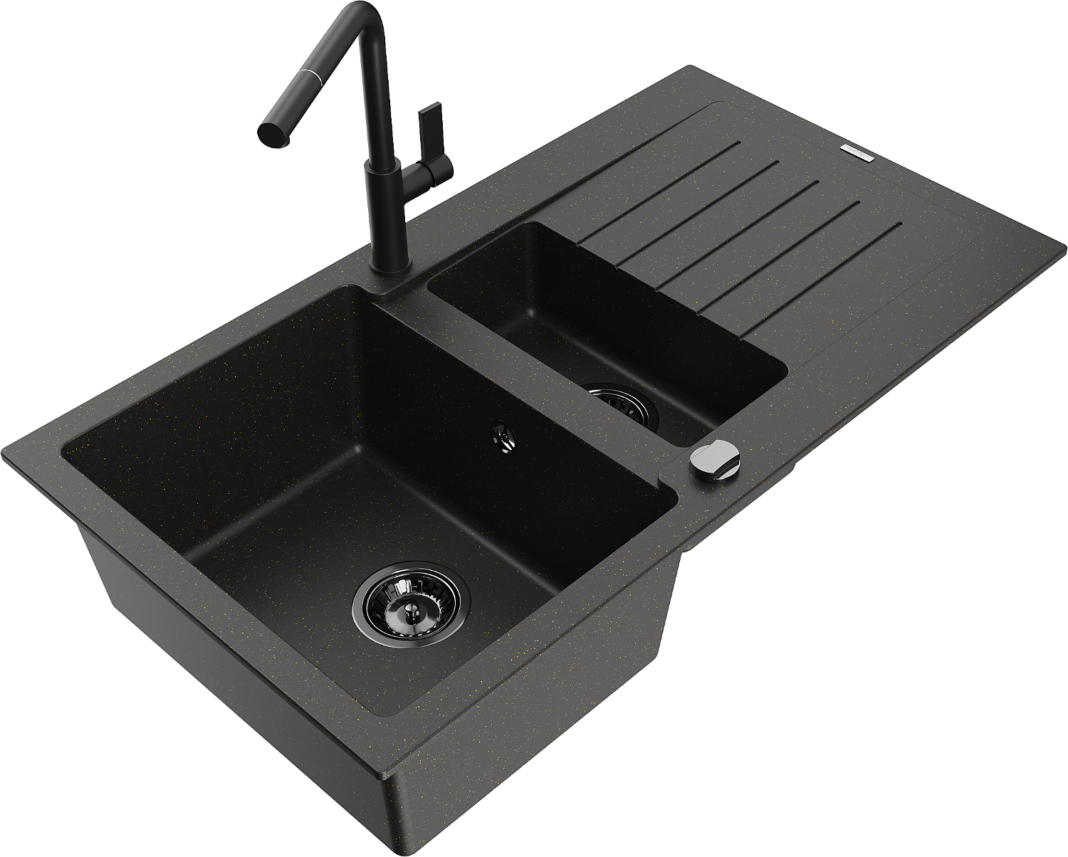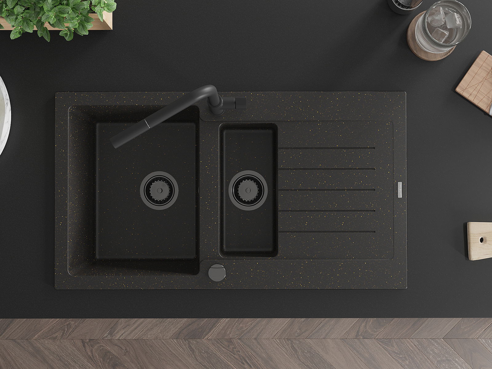 Mexen Matias granitový drez 1,5-komorový s odkvapkávačom a kuchynskou batériou Flora, čierny/zlatý - 6502-75-670401-70-B