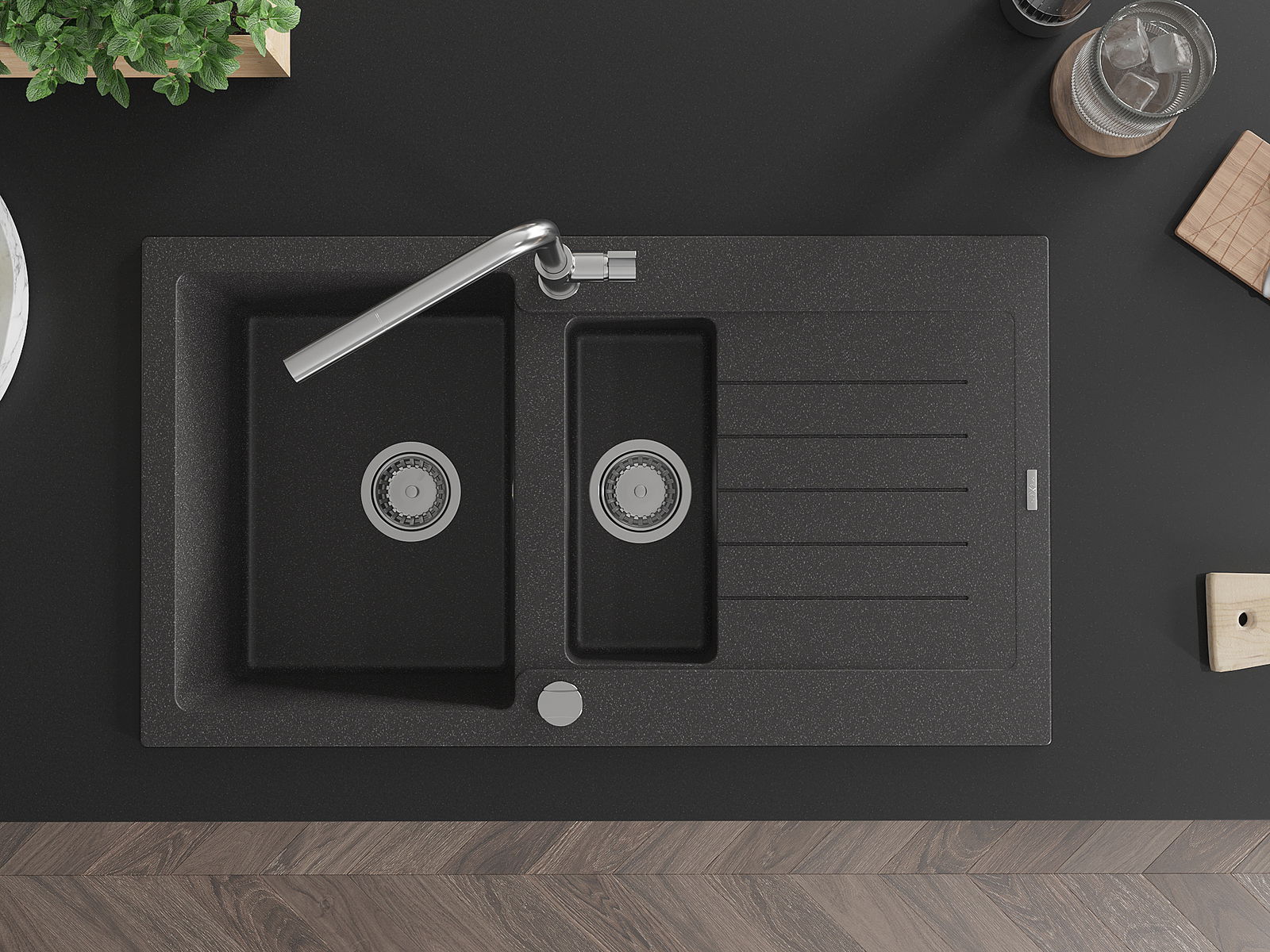 Povrch kuchynského drezu je odolný voči škvrnám a zafarbeniu, vďaka čomu sa ľahko udržiava a zachováva svoju farbu počas dlhého obdobia používania. Estetický a praktický doplnok pre každú kuchyňu.