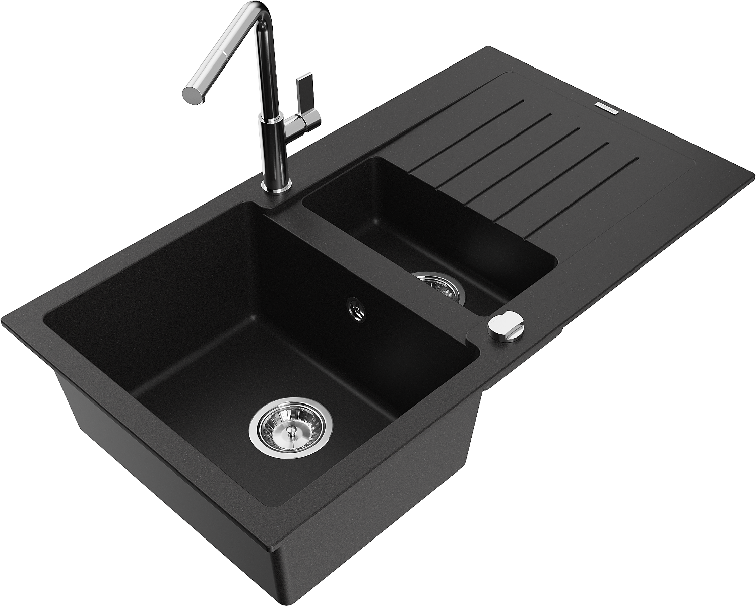 Mexen Matias granitový drez 1,5-komorový s odkvapkávačom a kuchynskou batériou Flora, čierny - 6502-77-670401-00