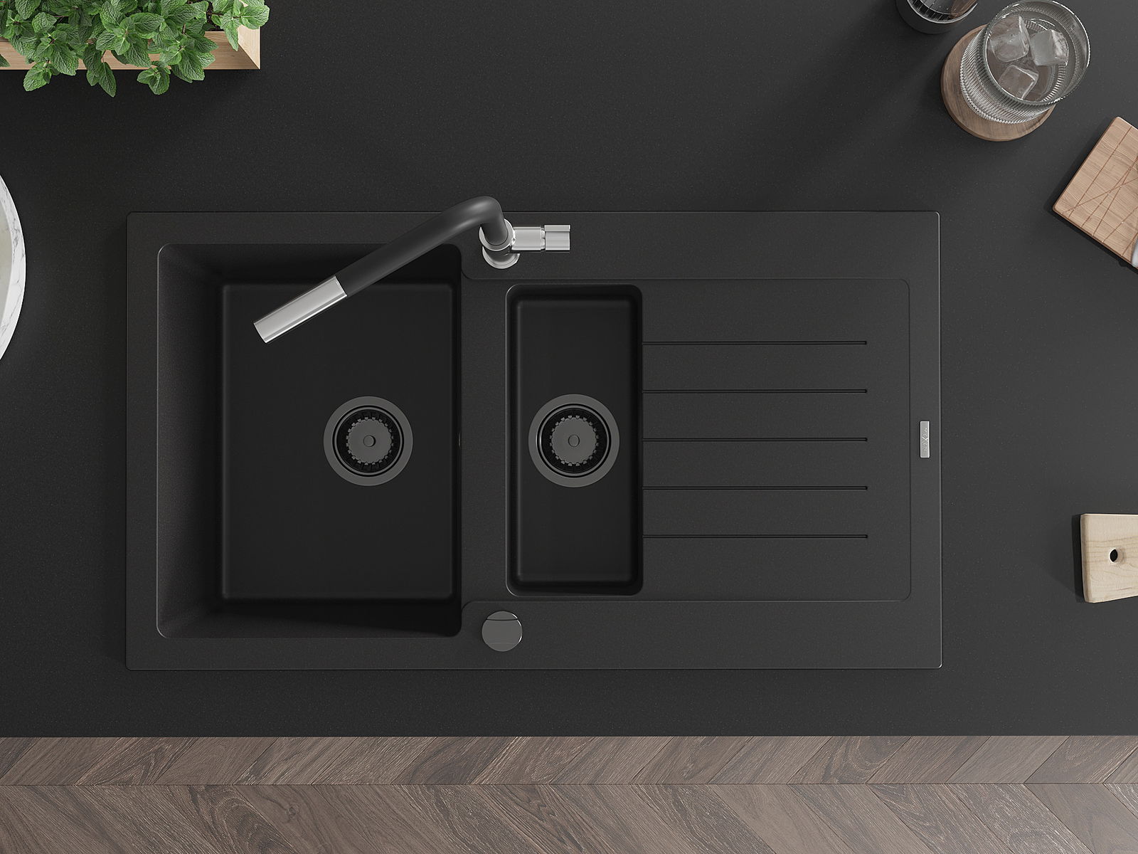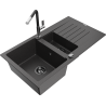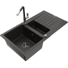 Mexen Matias granitový drez 1,5-komorový s odkvapkávačom a kuchynskou batériou Flora, čierny - 6502-77-670401-07-B