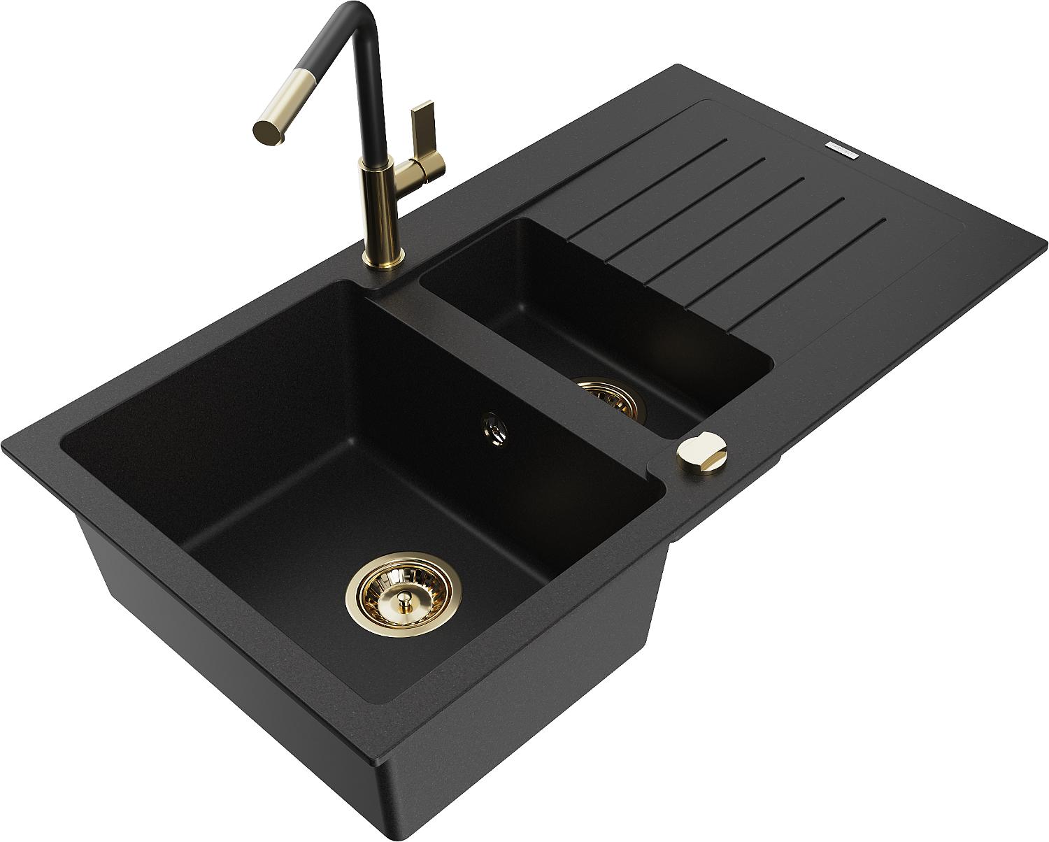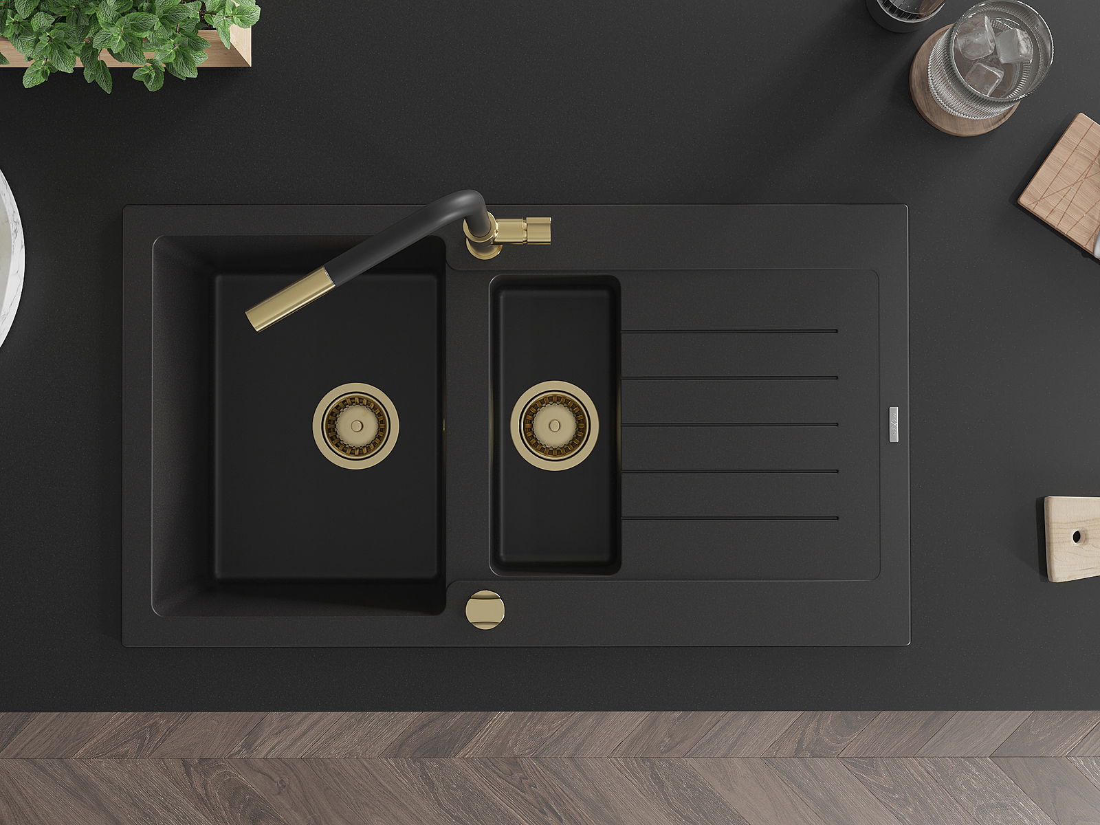 Mexen Matias žulový kuchynský drez 1,5-komorový s odkvapkávačom a kuchynskou batériou Flora, čierny - 6502-77-670401-57-G