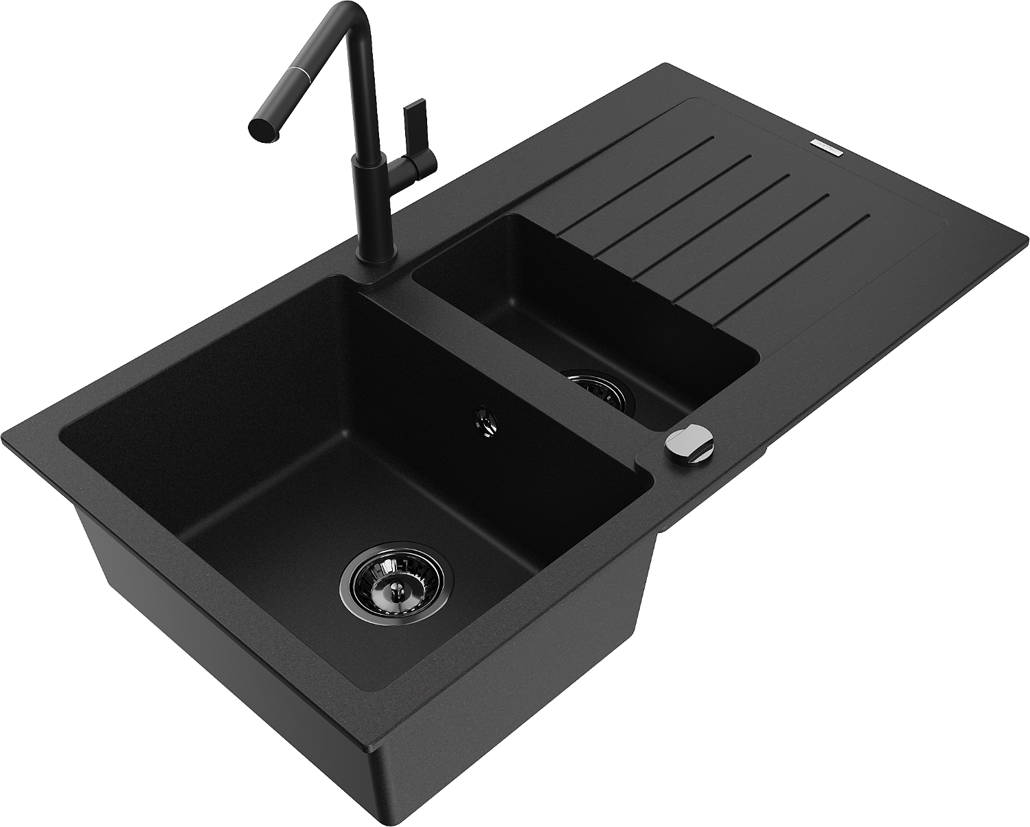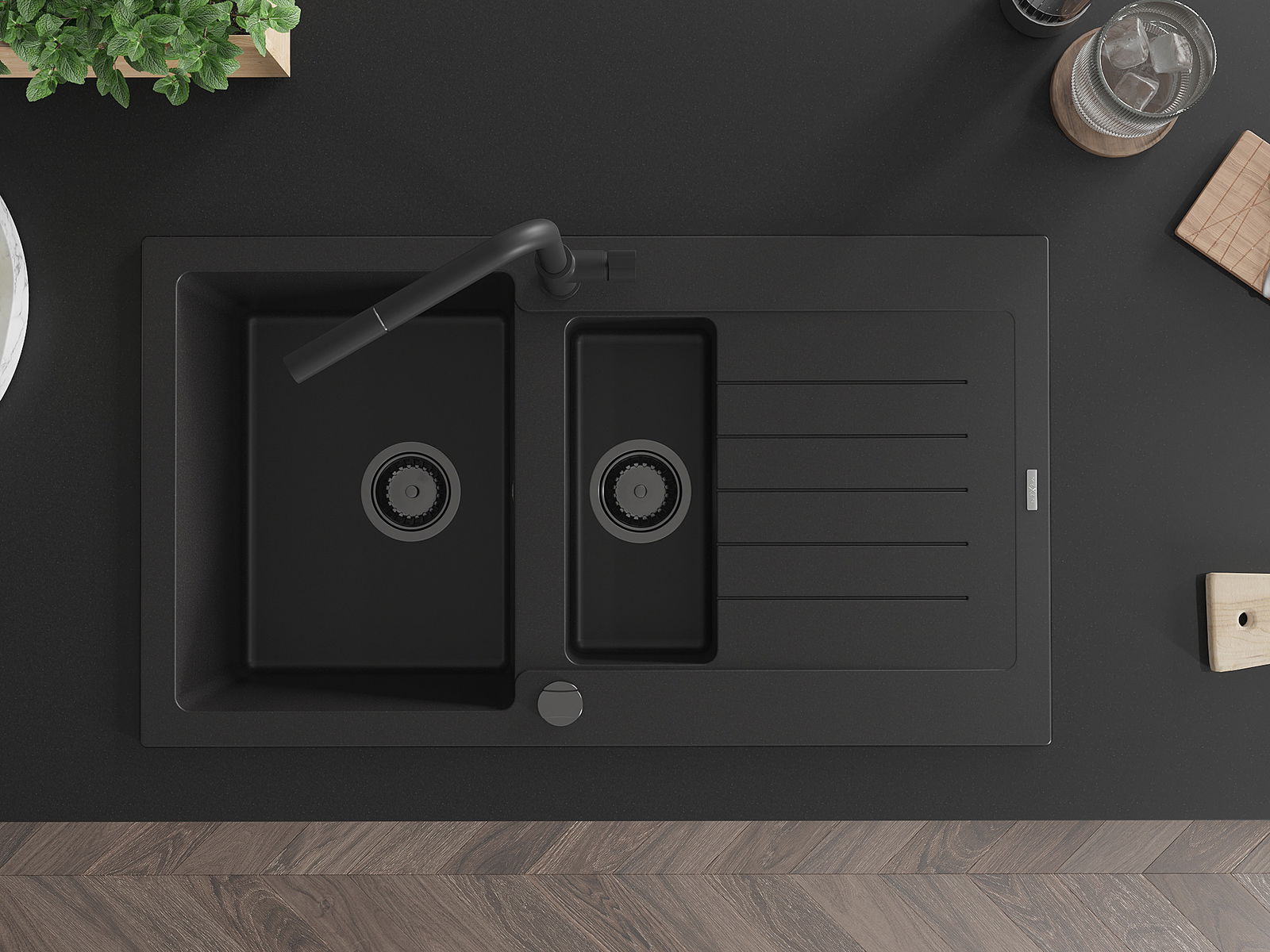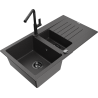 Mexen Matias granitový drez 1,5-komorový s odkvapkávačom a kuchynskou batériou Flora, čierny - 6502-77-670401-70-B