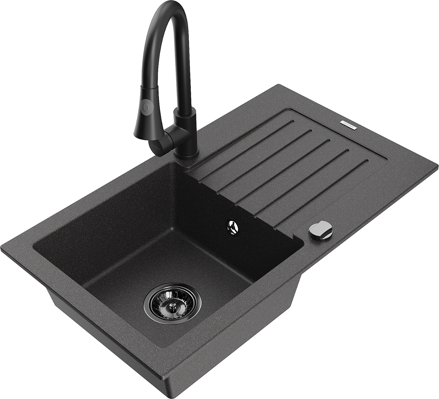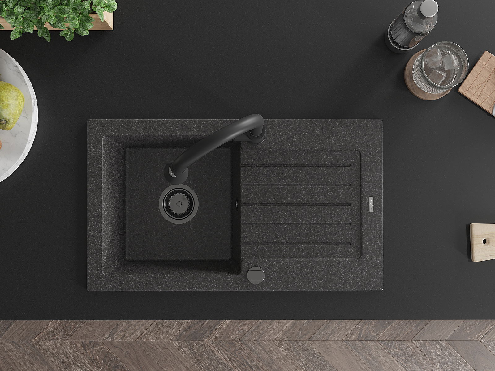 Mexen Pablo žulový drez 1-komorový s odkvapkávačom a kuchynskou batériou Elia, čierny s bodkami - 6510-76-670101-70-B