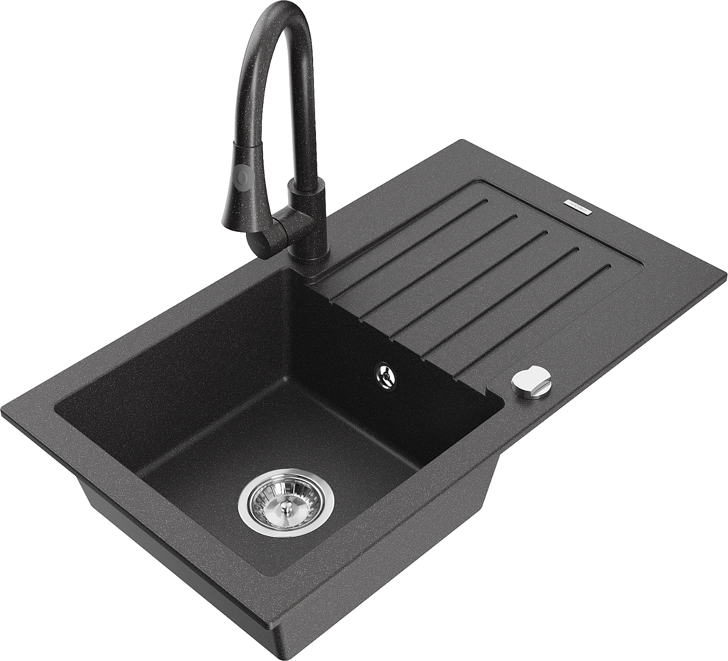 Mexen Pablo žulový drez 1-komorový s odkvapkávačom a kuchynskou batériou Elia, čierny s bodkami - 6510-76-670101-76