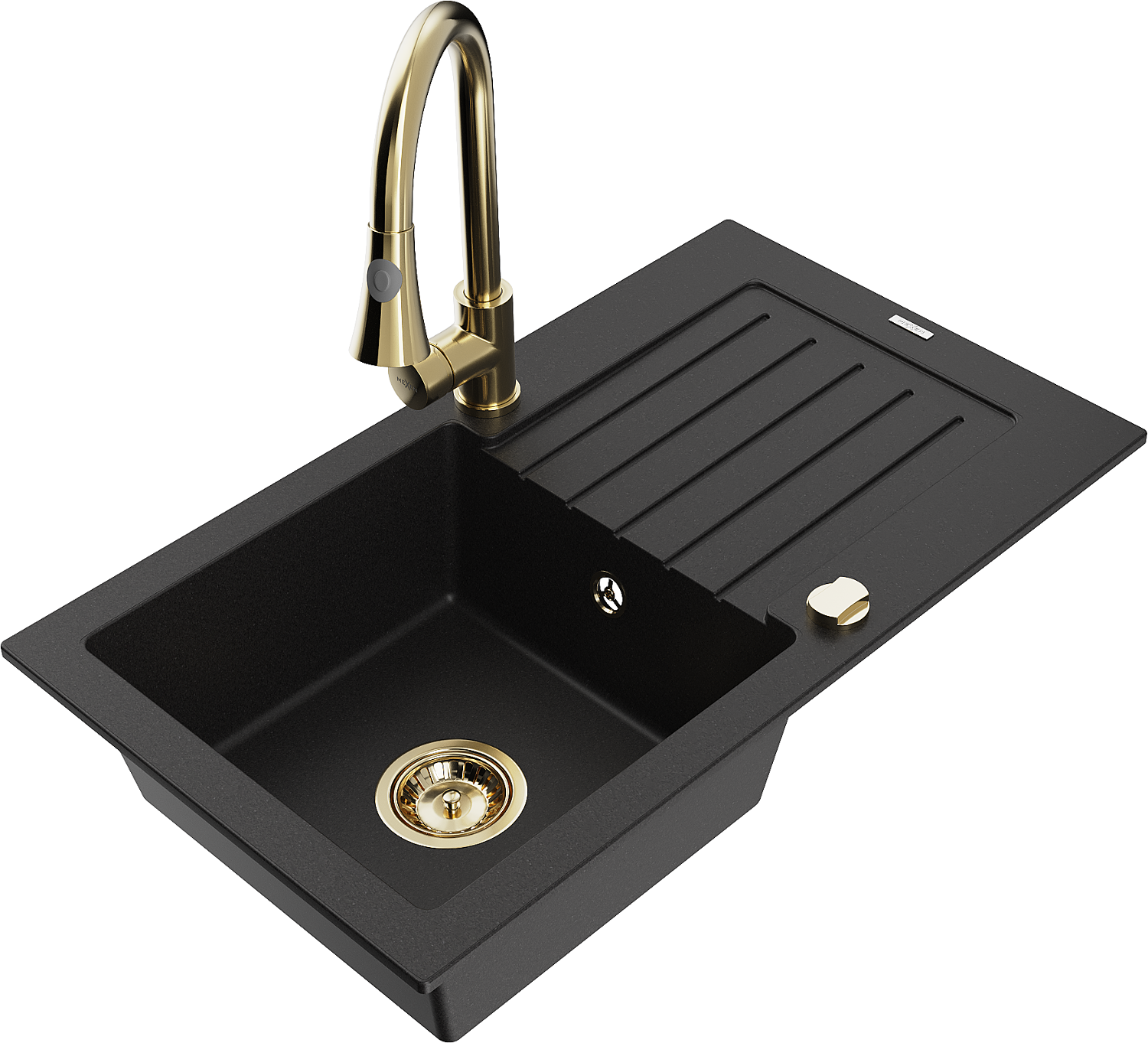 Mexen Pablo žulový kuchynský drez s 1-komorou, odkvapkávačom a kuchynskou batériou Elia, čierny - 6510-77-670101-50