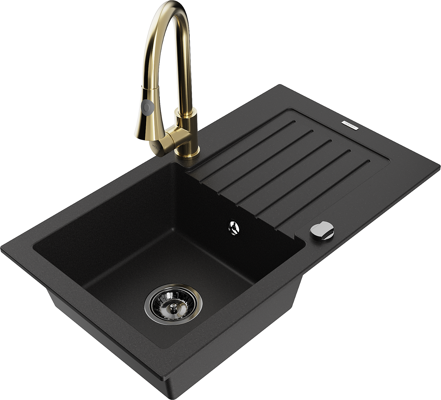 Mexen Pablo žulový drez s 1 komorou, s odkvapkávačom a kuchynskou batériou Elia, čierny - 6510-77-670101-50-B