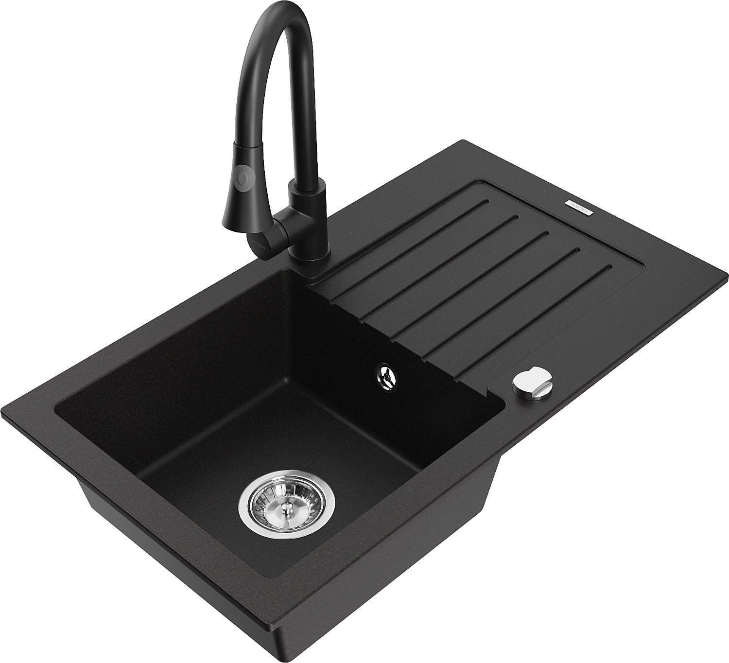 Mexen Pablo granitový kuchynský drez 1-komorový s odkvapkávačom a kuchynskou batériou Elia, čierny - 6510-77-670101-70