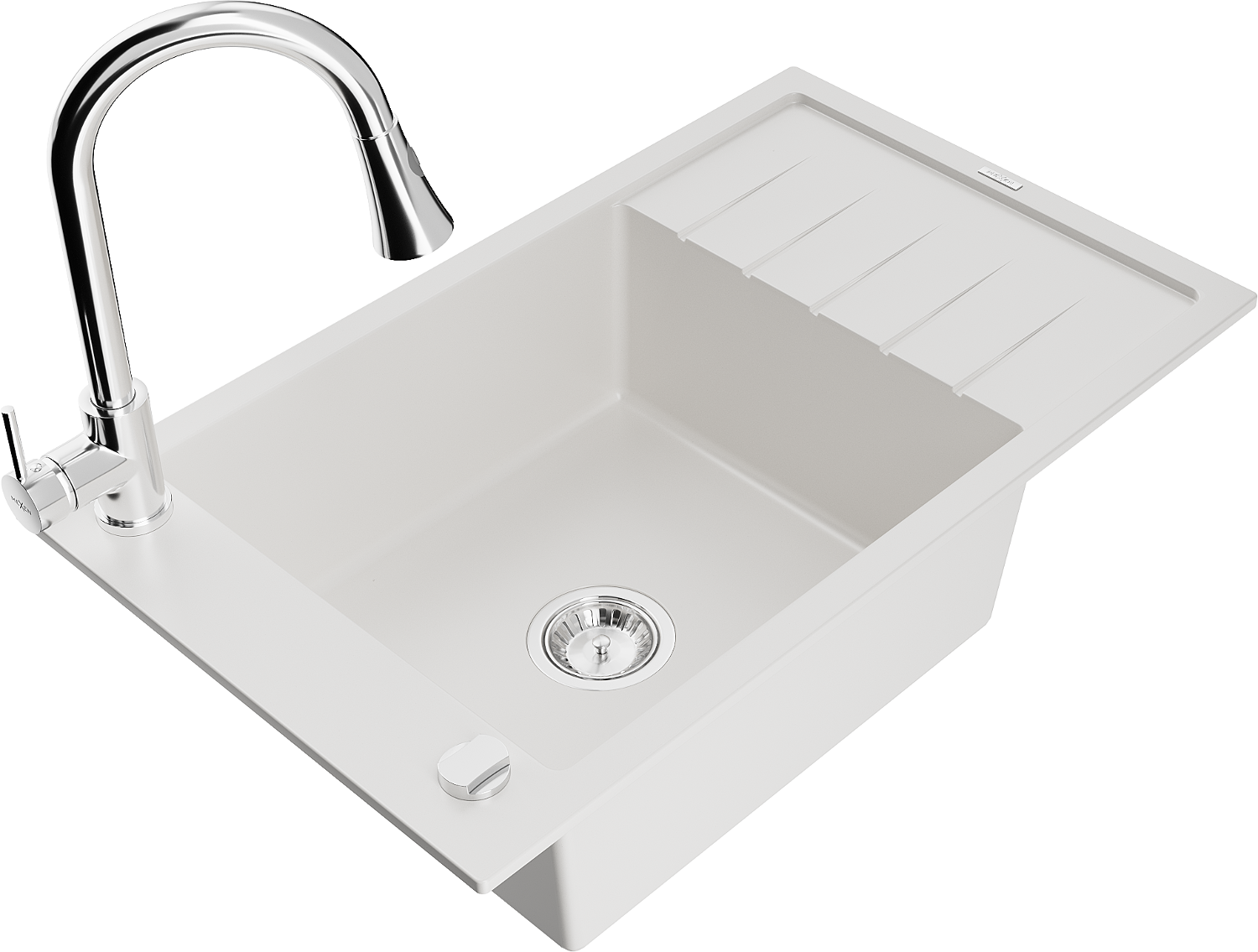 Mexen Elias žulový kuchynský drez 1-komorový s odkvapkávačom a kuchynskou batériou Elia, biely - 6511-20-670101-00