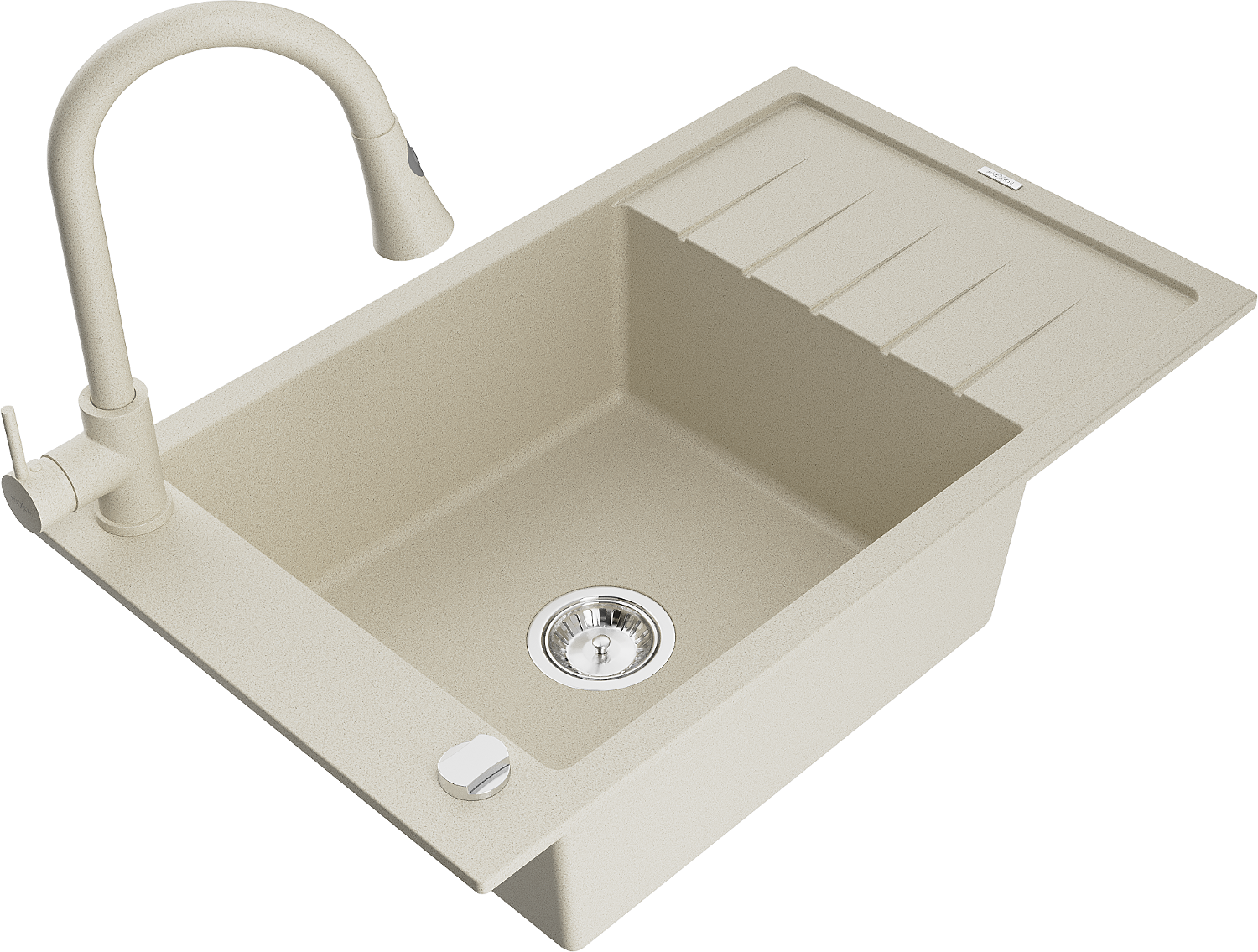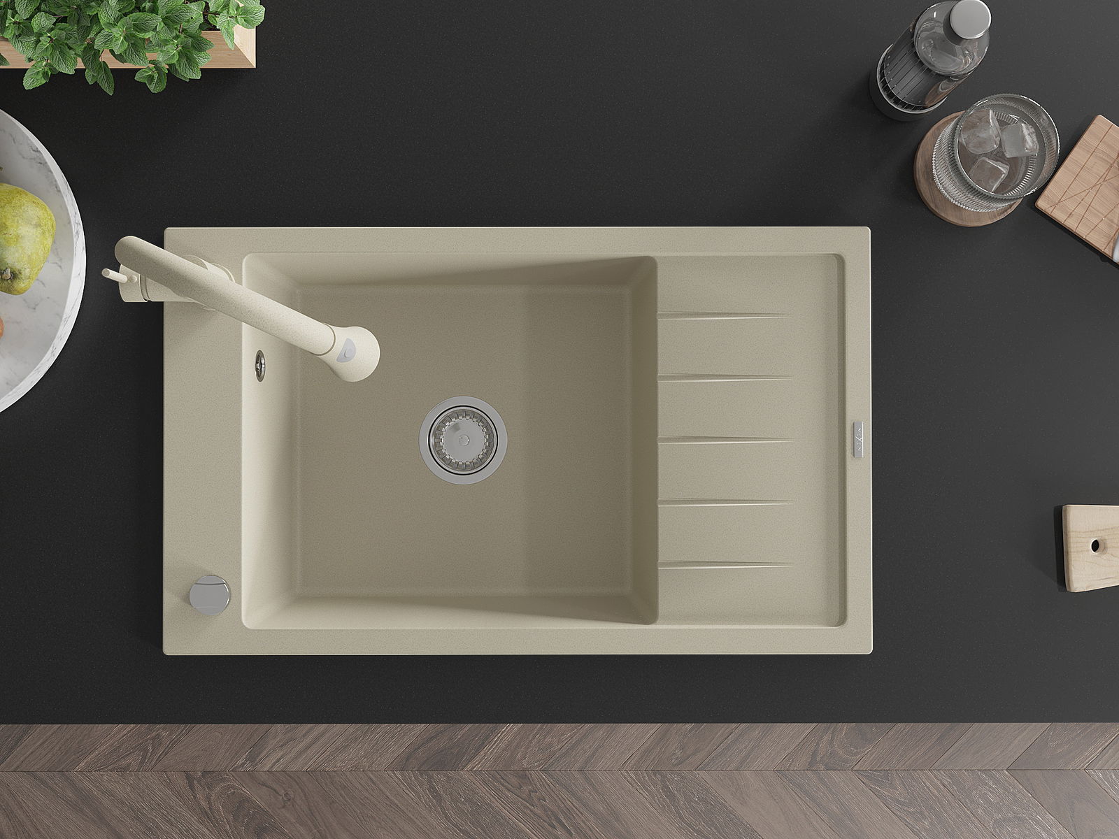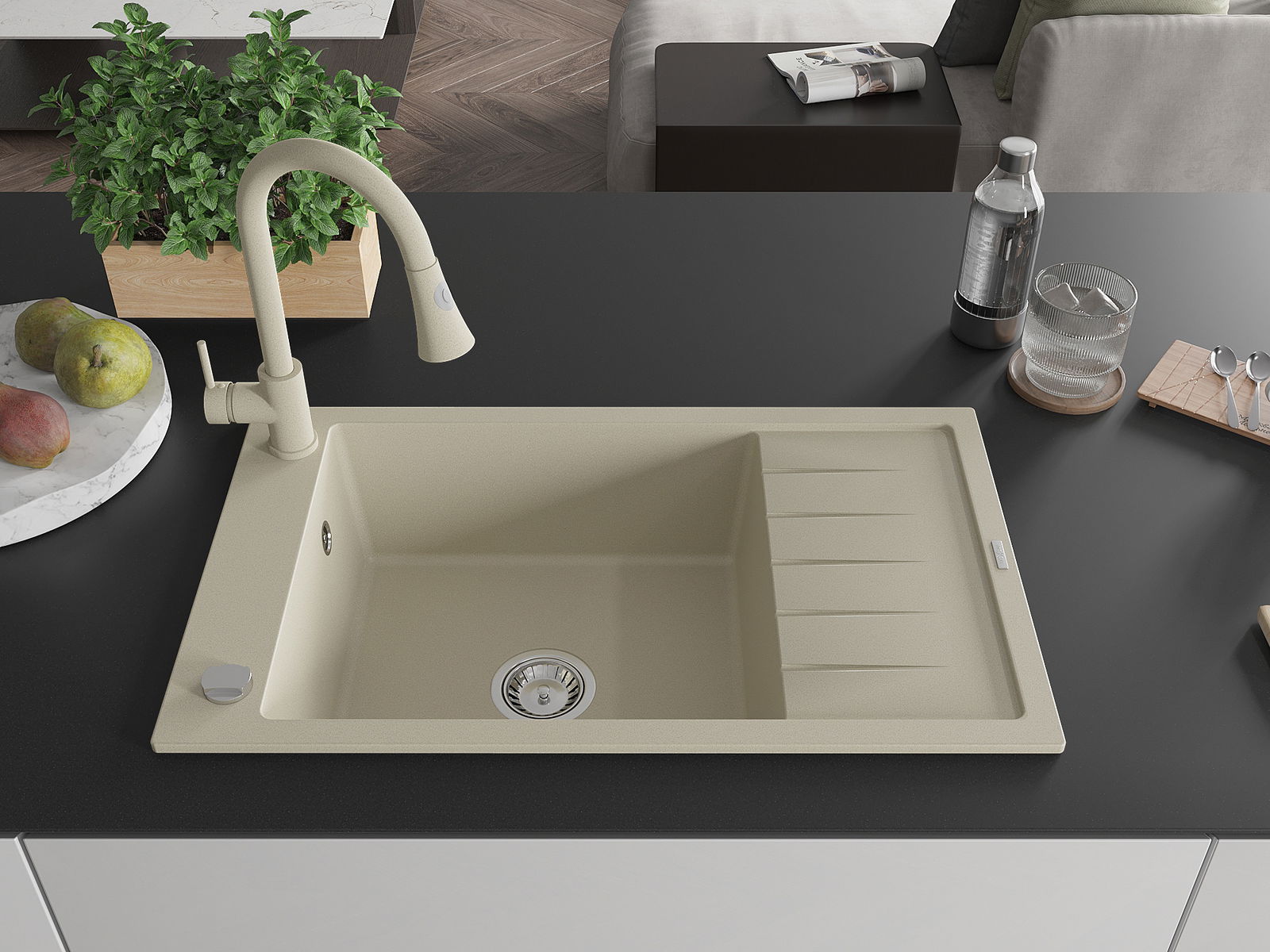 Mexen Elias žulový kuchynský drez s 1 miskou a odkvapkávačom a kuchynskou batériou Elia, béžový - 6511-69-670101-69