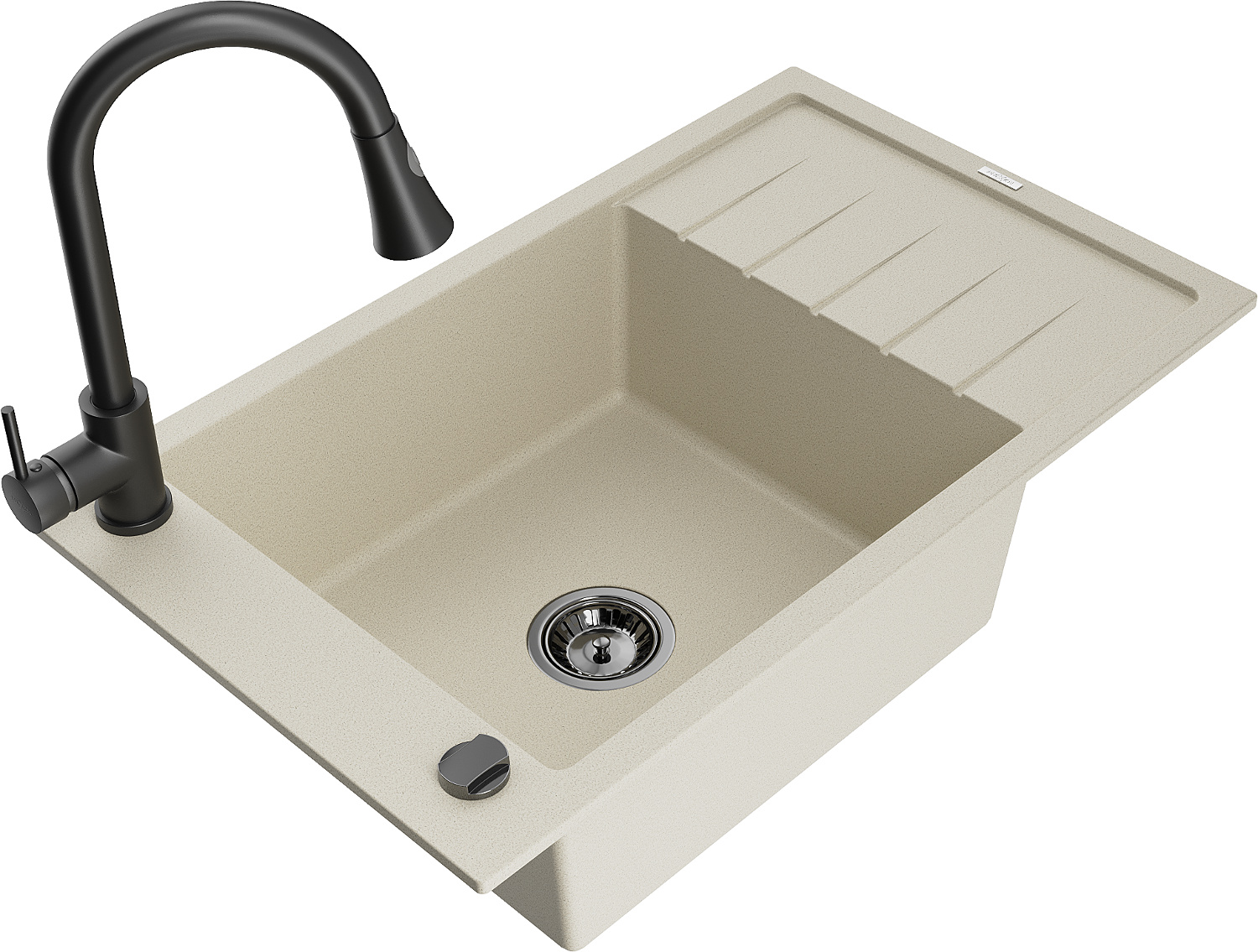 Mexen Elias granitový drez 1-komorový s odkvapkávačom a kuchynskou batériou Elia, béžový- 6511-69-670101-70