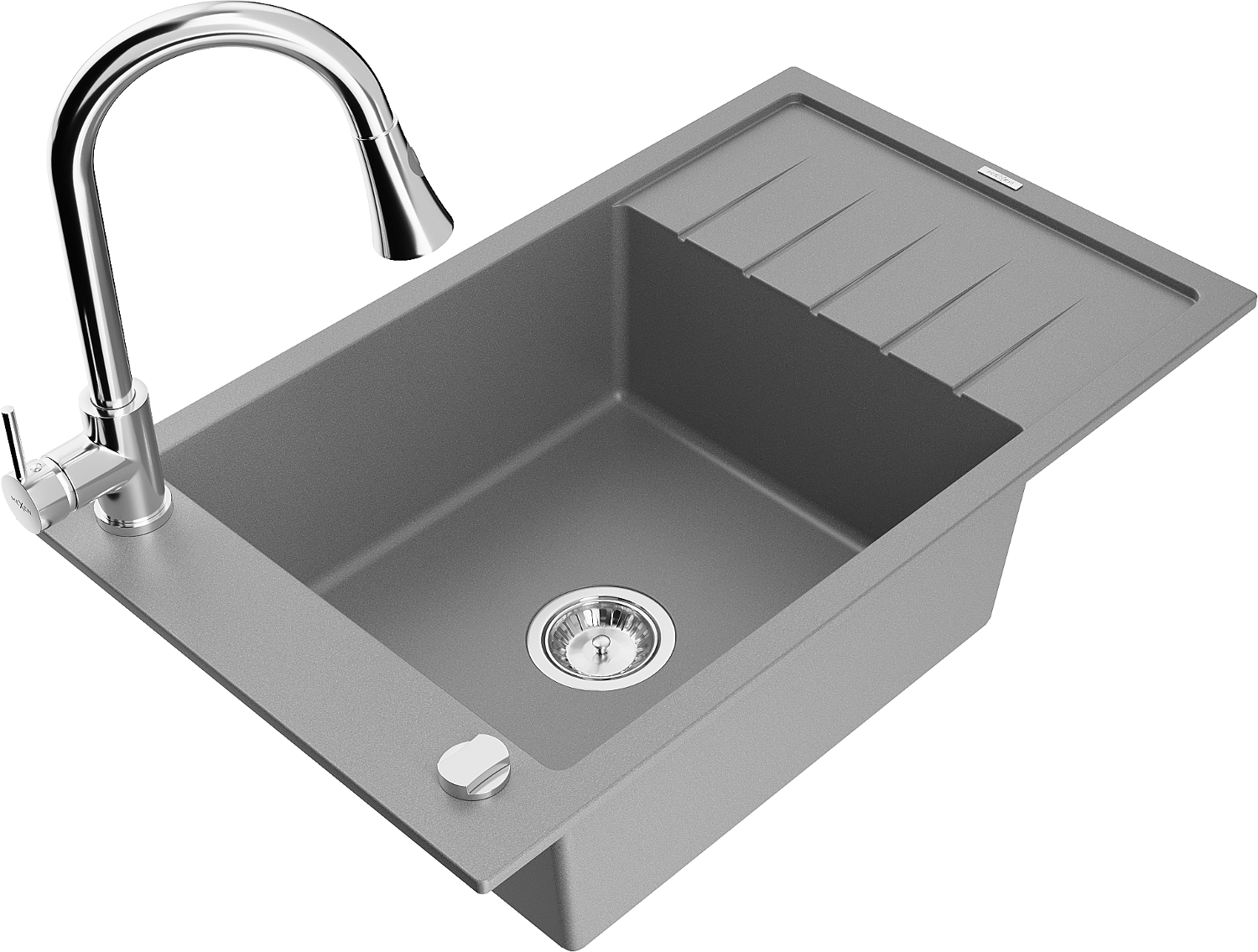 Mexen Elias kuchynský drez z granitu 1-komorový s odkvapkávačom a kuchynskou batériou Elia, šedý - 6511-71-670101-00