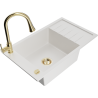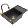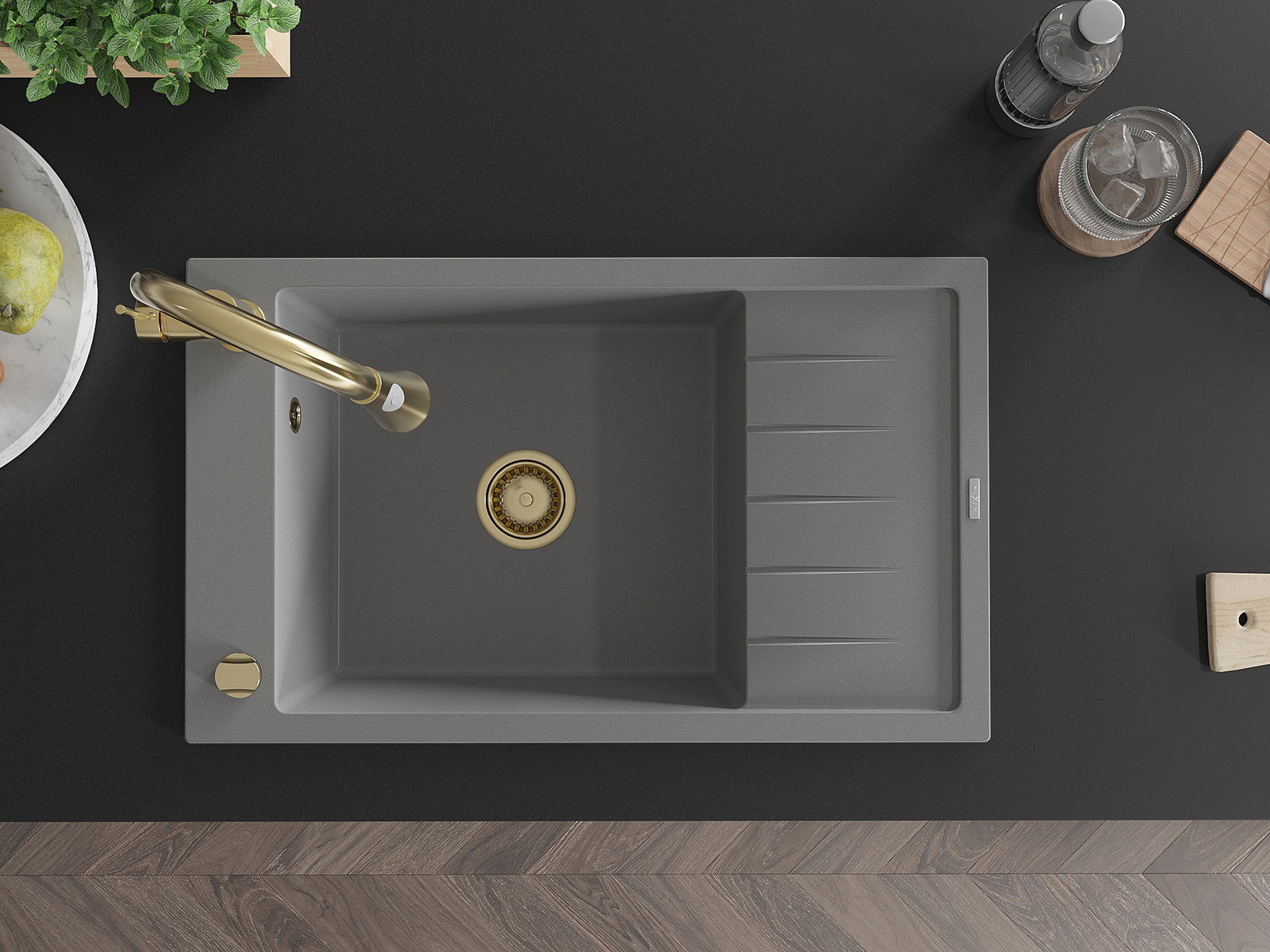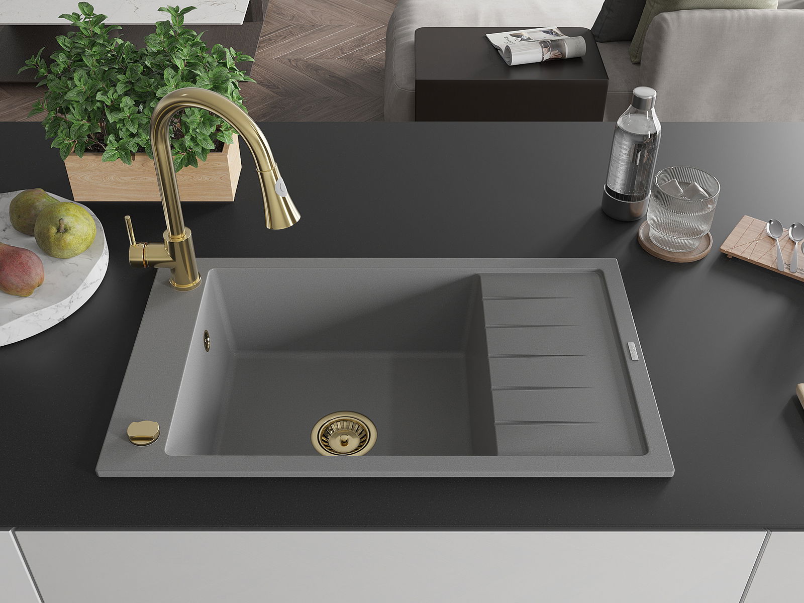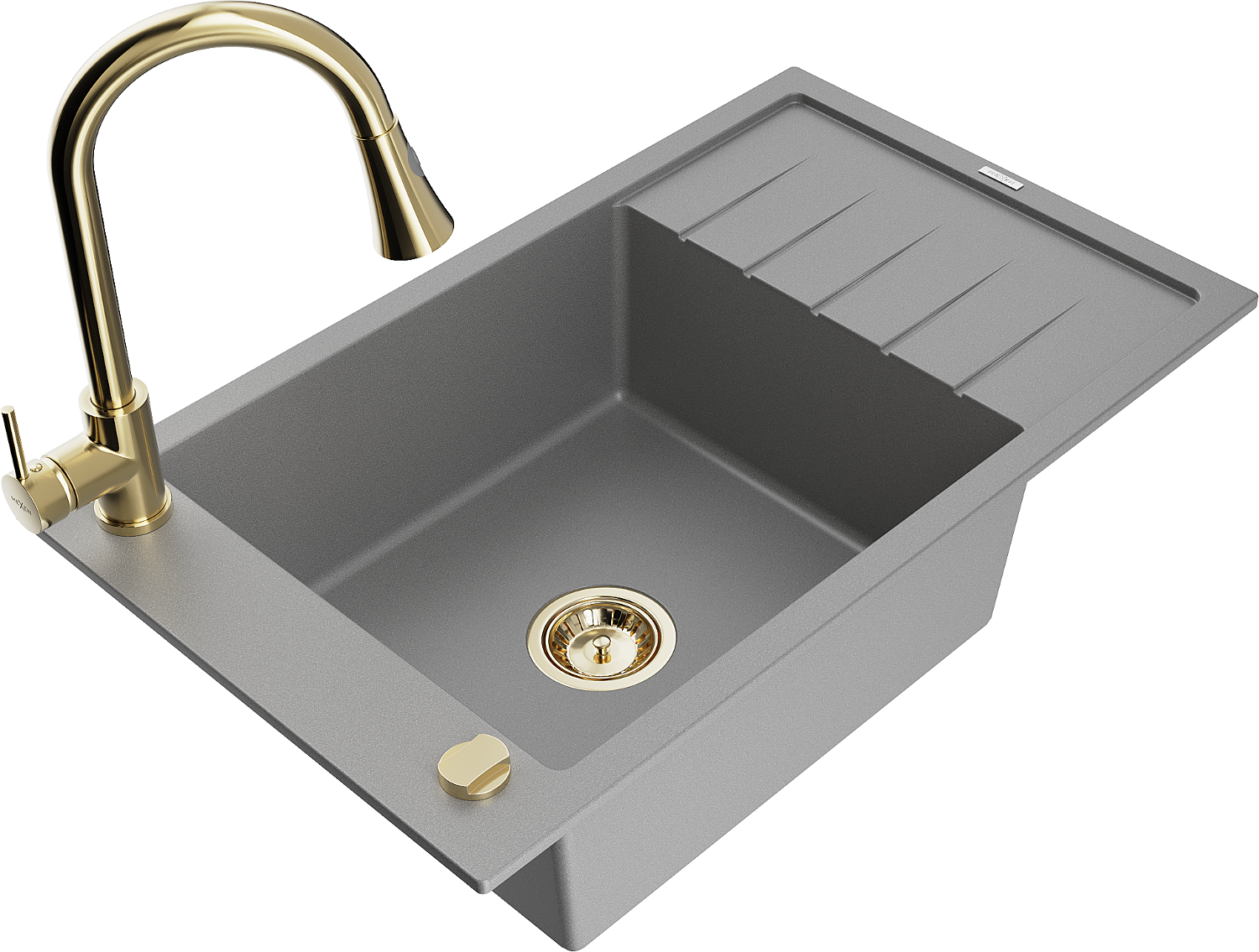 Mexen Elias granitový drez 1-komorový s odkvapkávačom a kuchynskou batériou Elia, sivý - 6511-71-670101-50