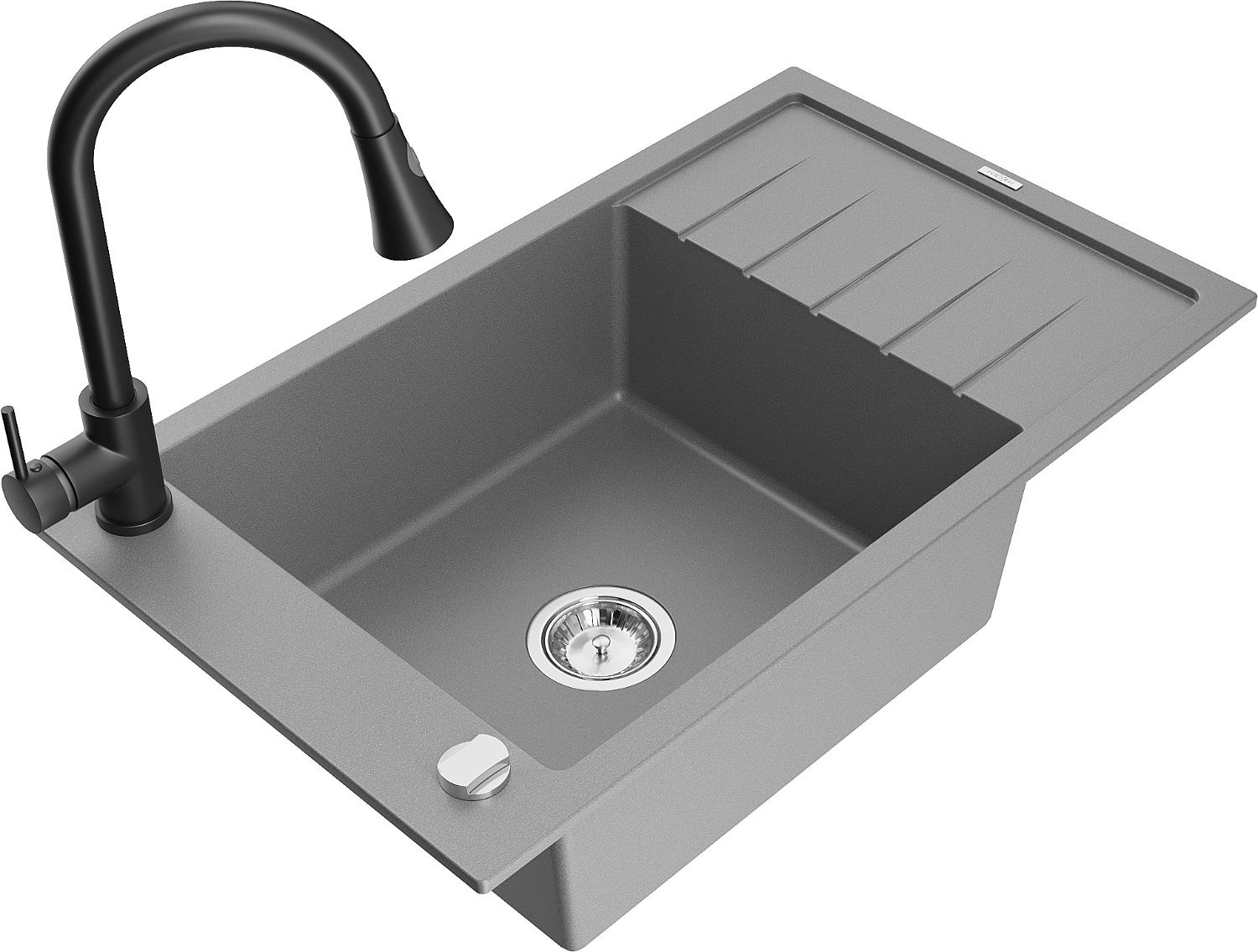Mexen Elias žulový kuchynský drez s 1 preliačinou s odkvapkávačom a kuchynskou batériou Elia, sivý - 6511-71-670101-70