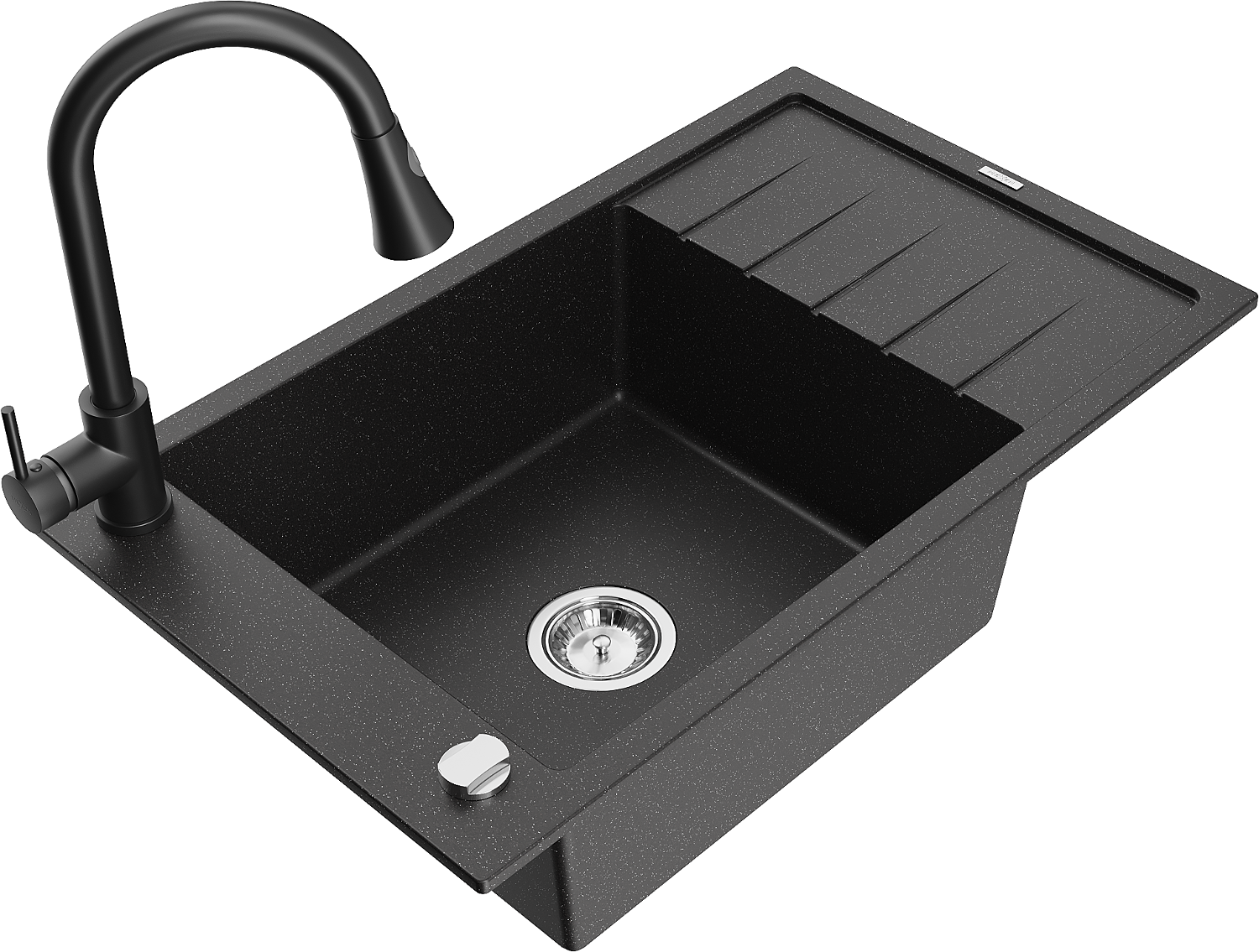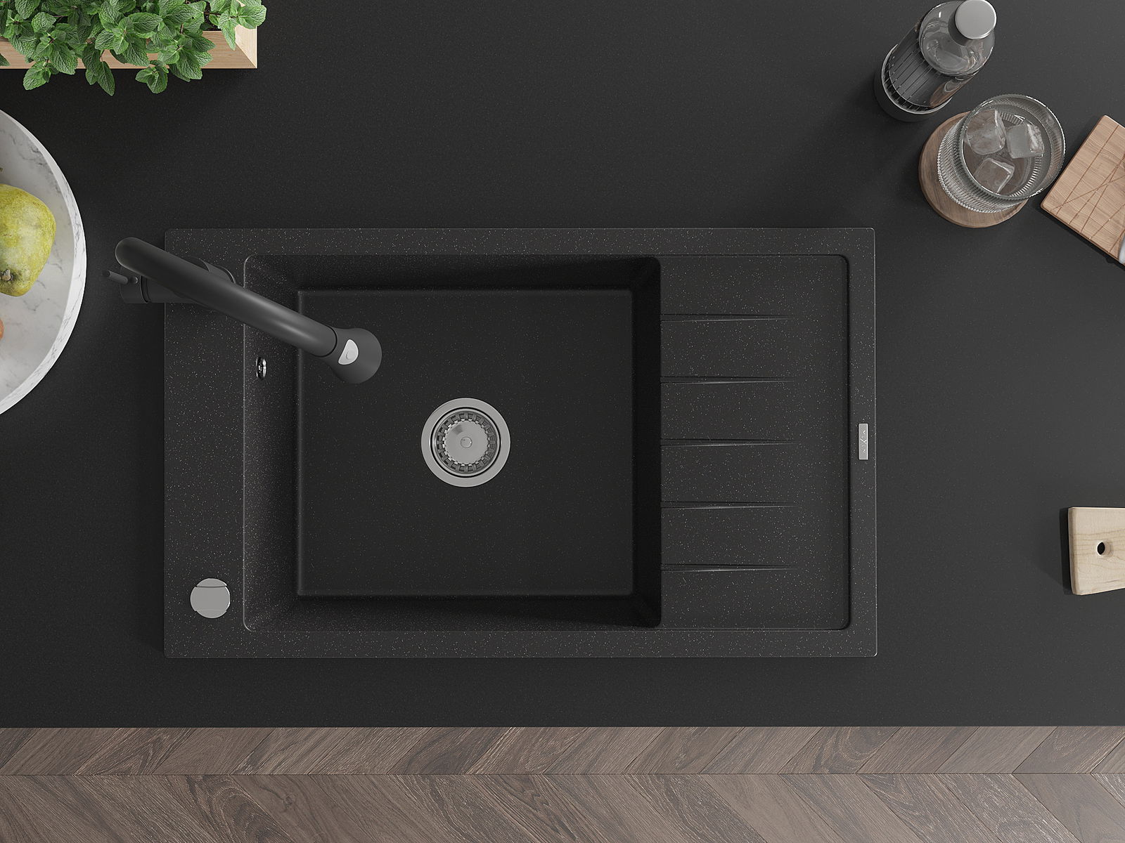 Mexen Elias Granitový kuchynský drez s 1 komorou, odkvapkávačom a kuchynskou batériou Elia, čierny/strieborný metalický
