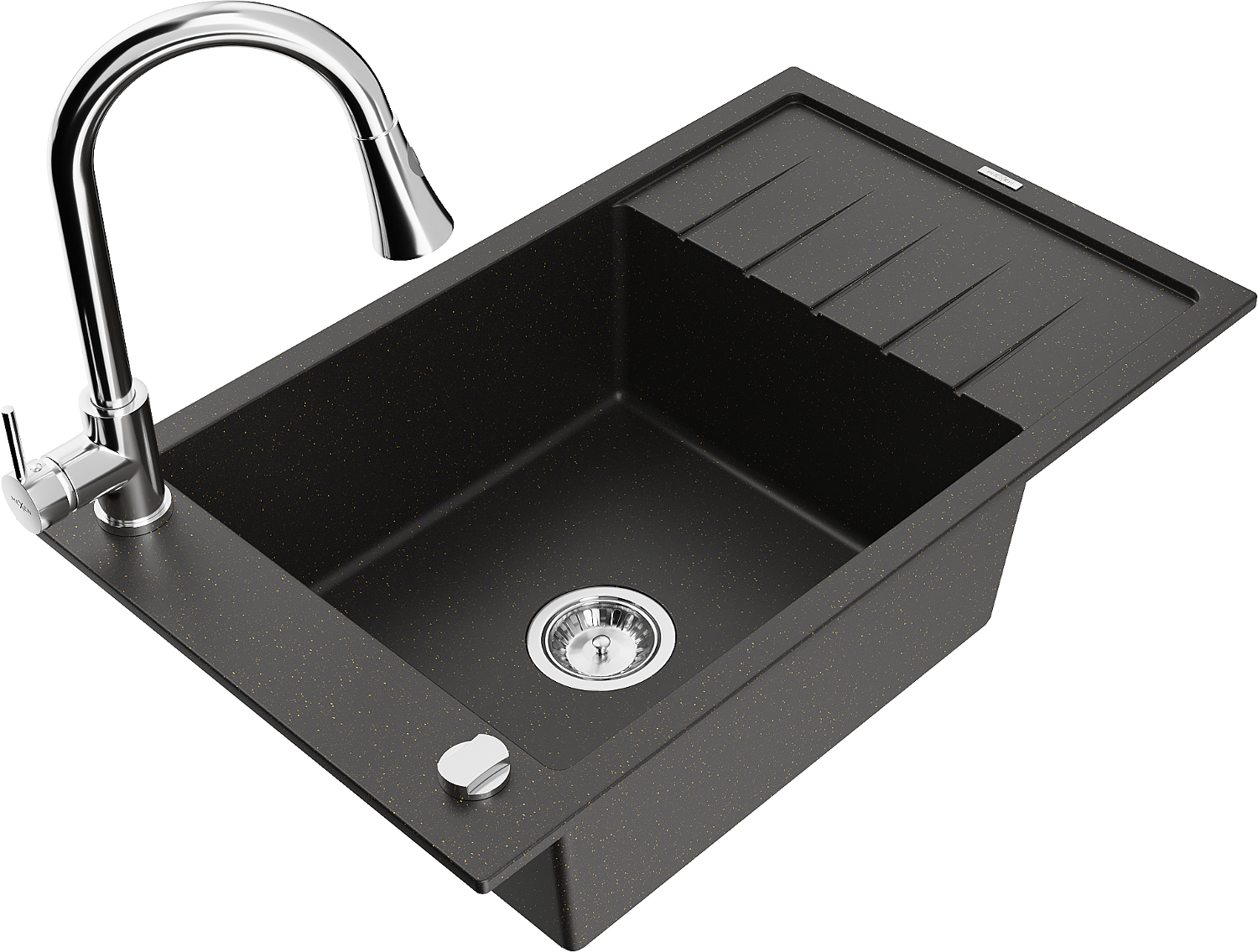 Mexen Elias granitový jednodrez s odkvapkávačom a kuchynskou batériou Elia, čierny/zlatý metalický - 6511-75-670101-00