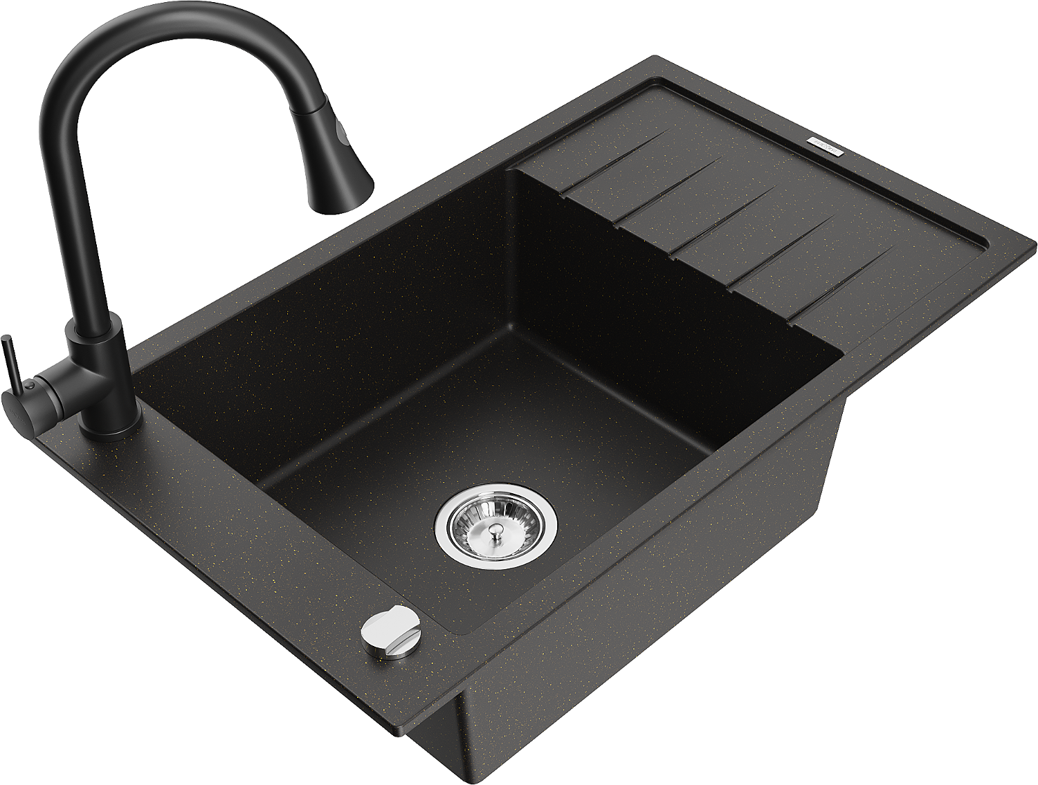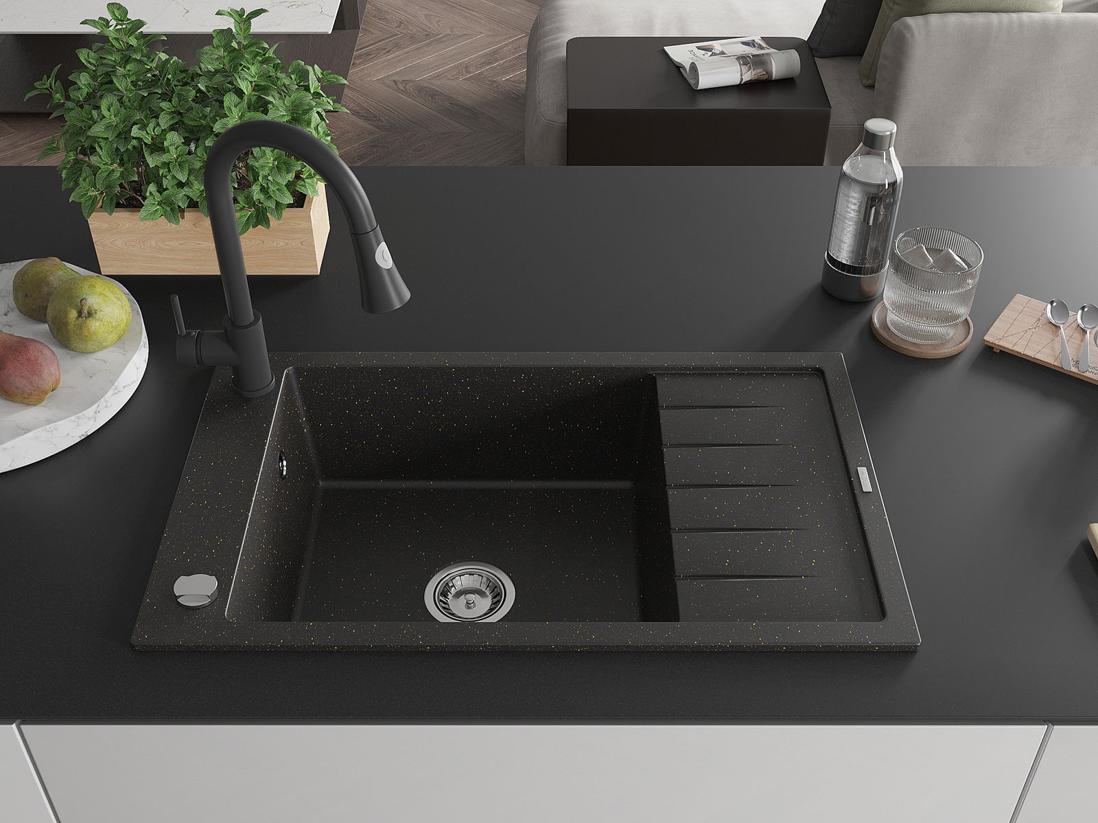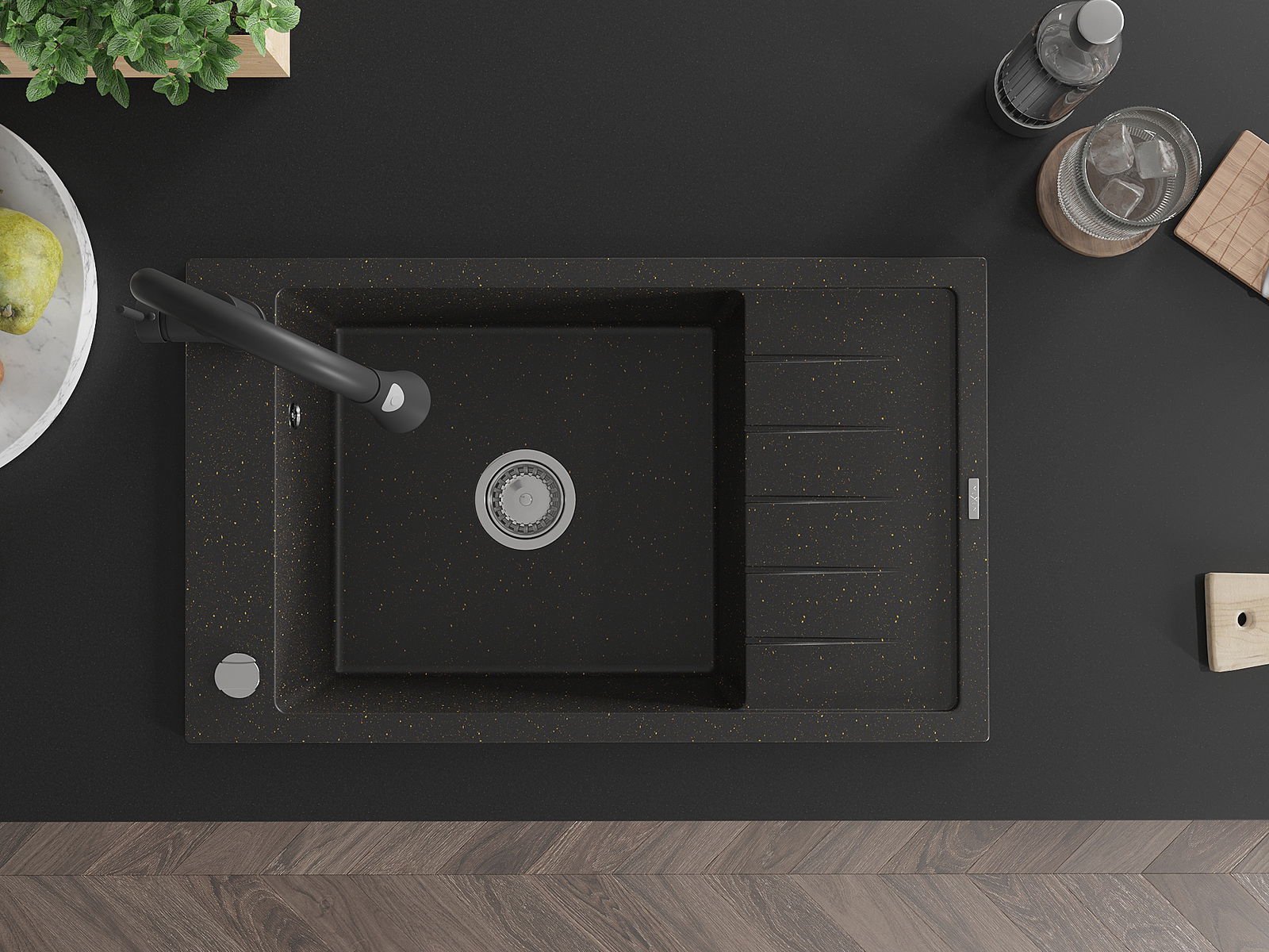 Mexen Elias granitový kuchynský drez 1-komorový s odkvapom a kuchynskou batériou Elia, čierny/zlatý metalik - 6511-75-670101-70