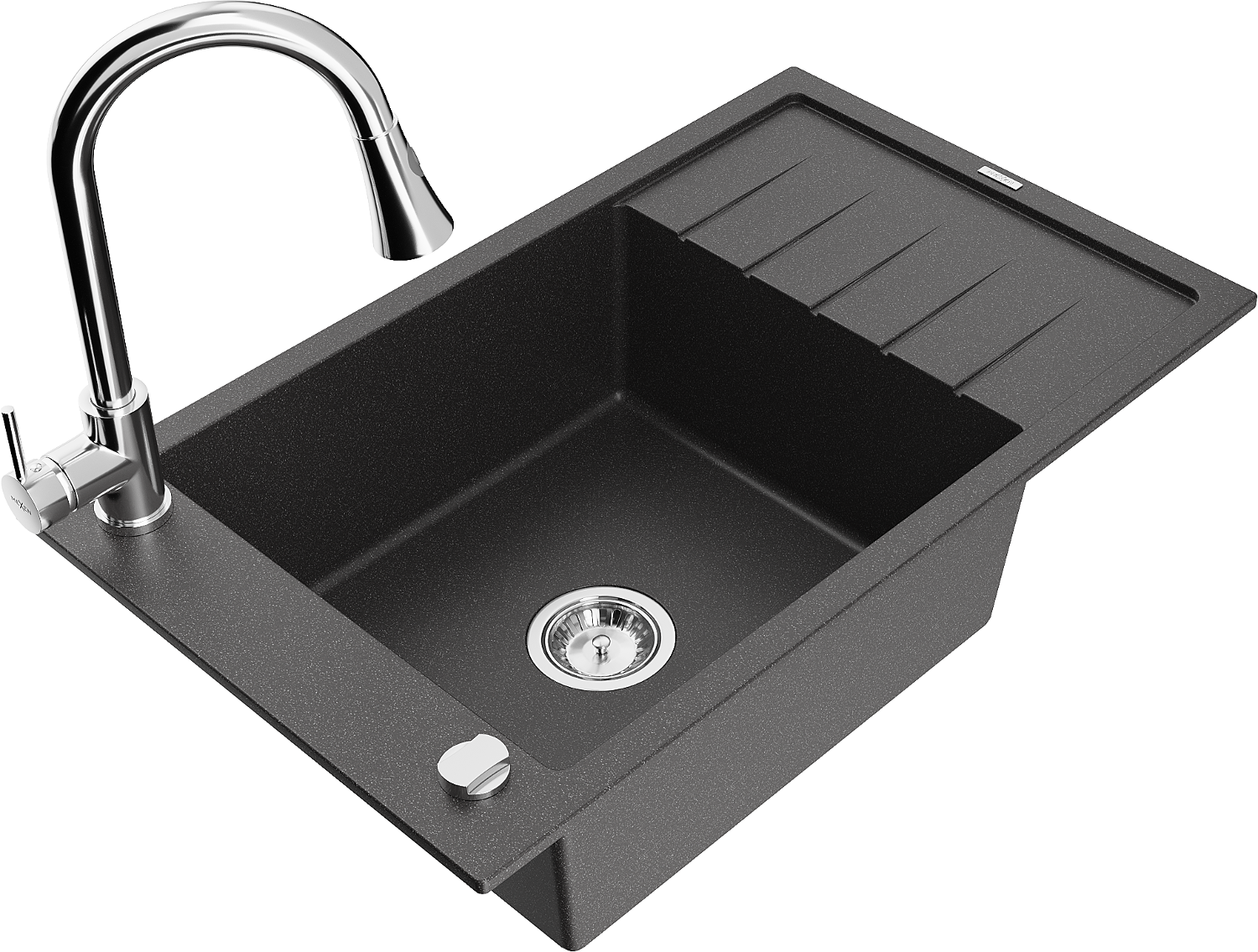 Mexen Elias žulový kuchynský drez 1-komorový s odkvapkávačom a kuchynskou batériou Elia, čierny fľakatý - 6511-76-670101-00