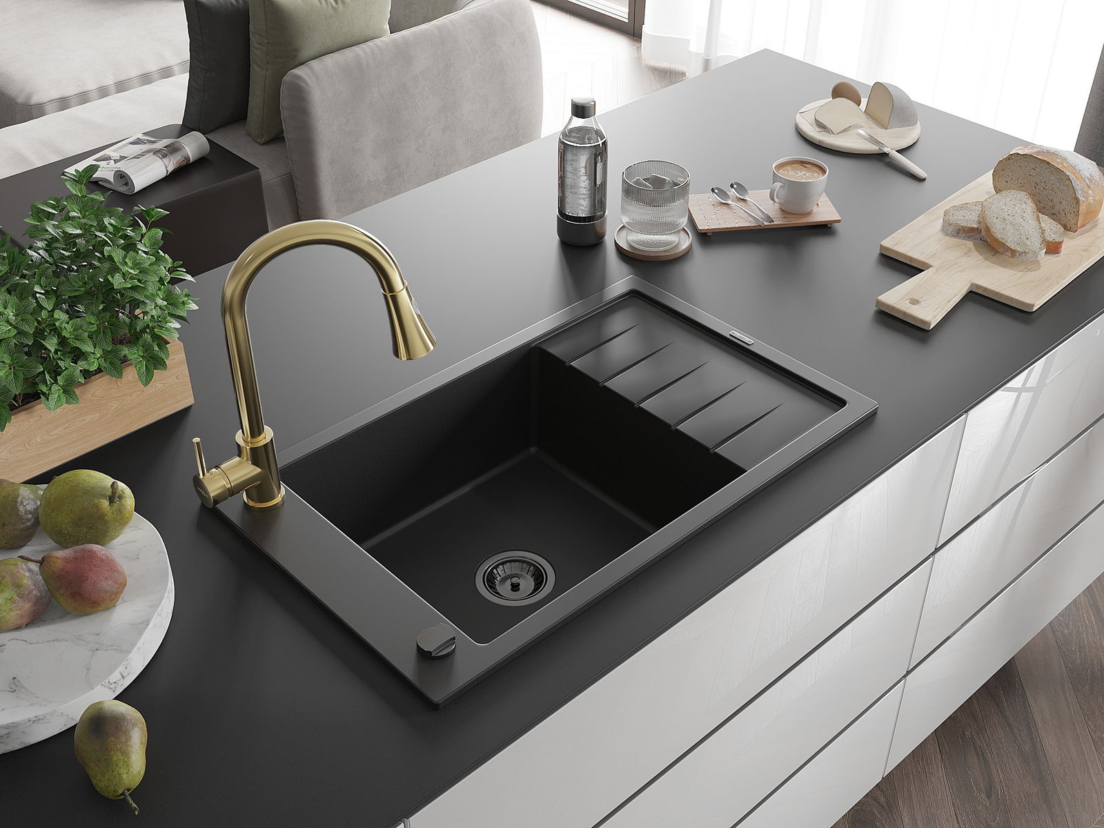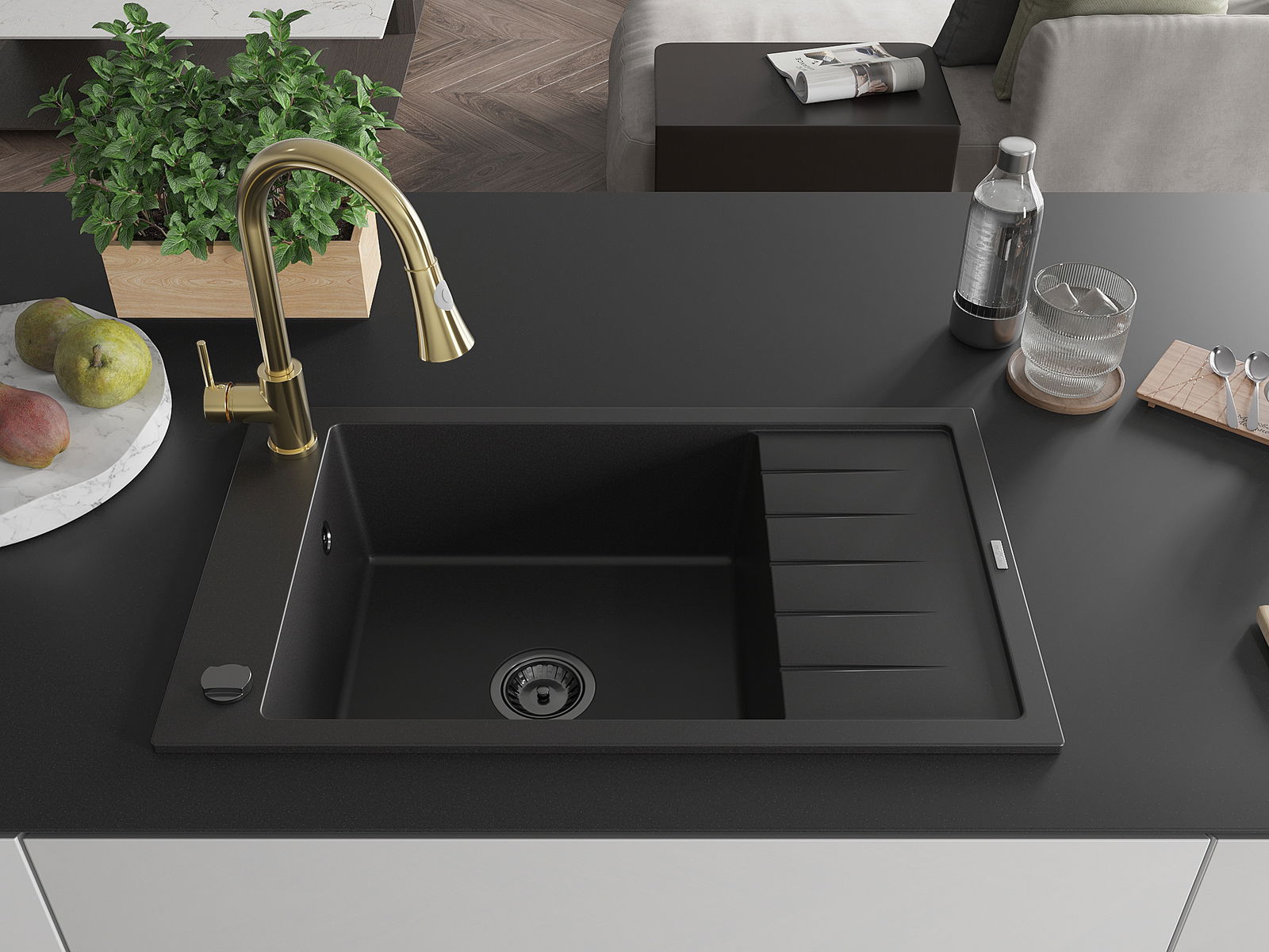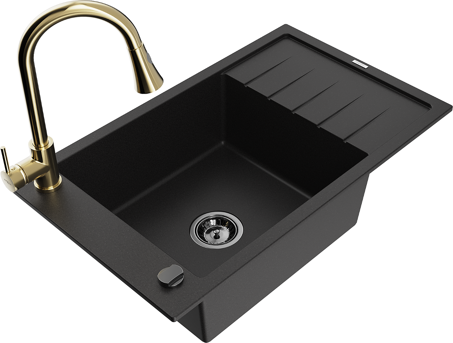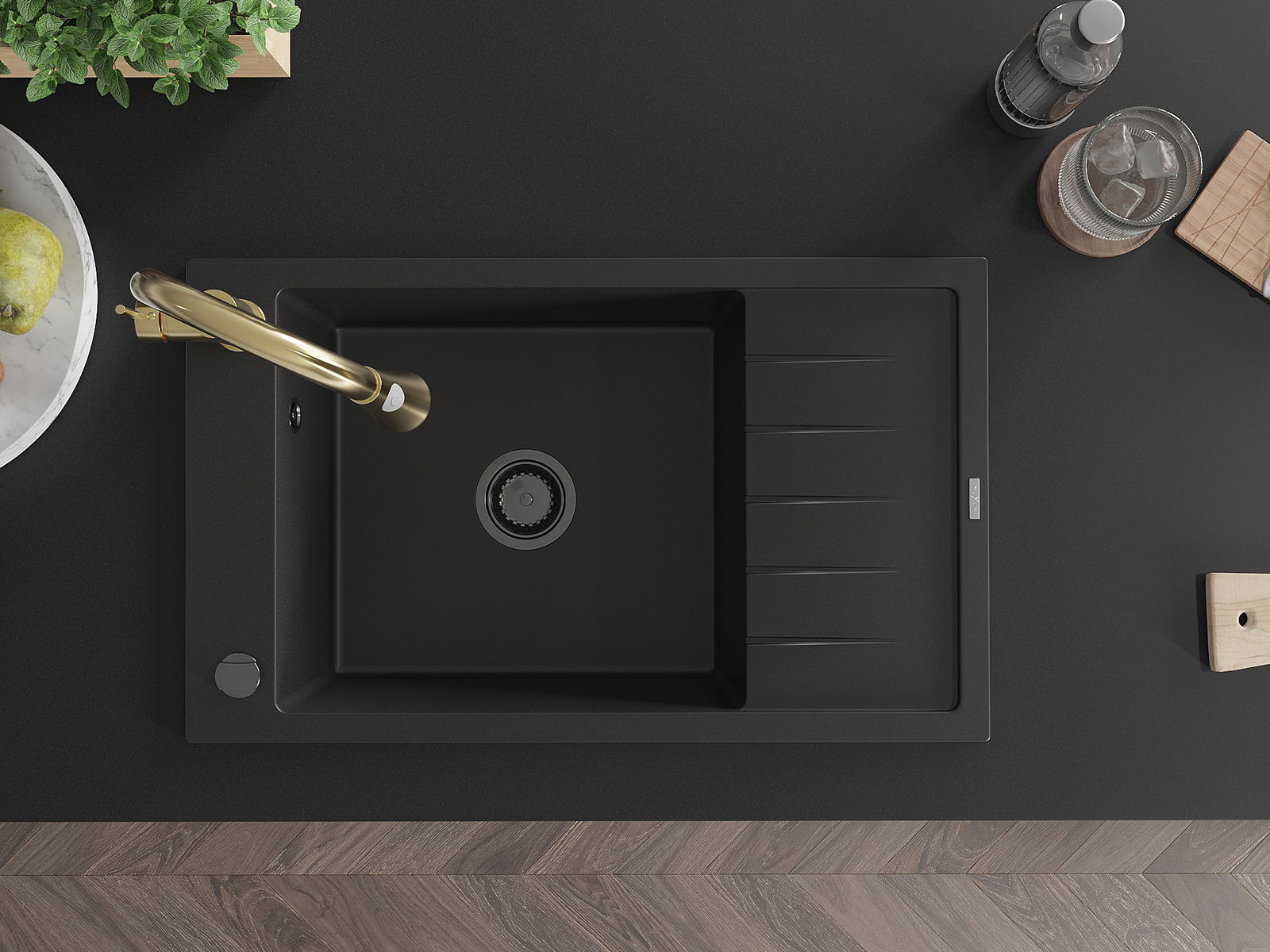 Mexen Elias granitový drez s 1-komorou s odkvapkávacou plochou a kuchynskou batériou Elia, čierny - 6511-77-670101-50-B