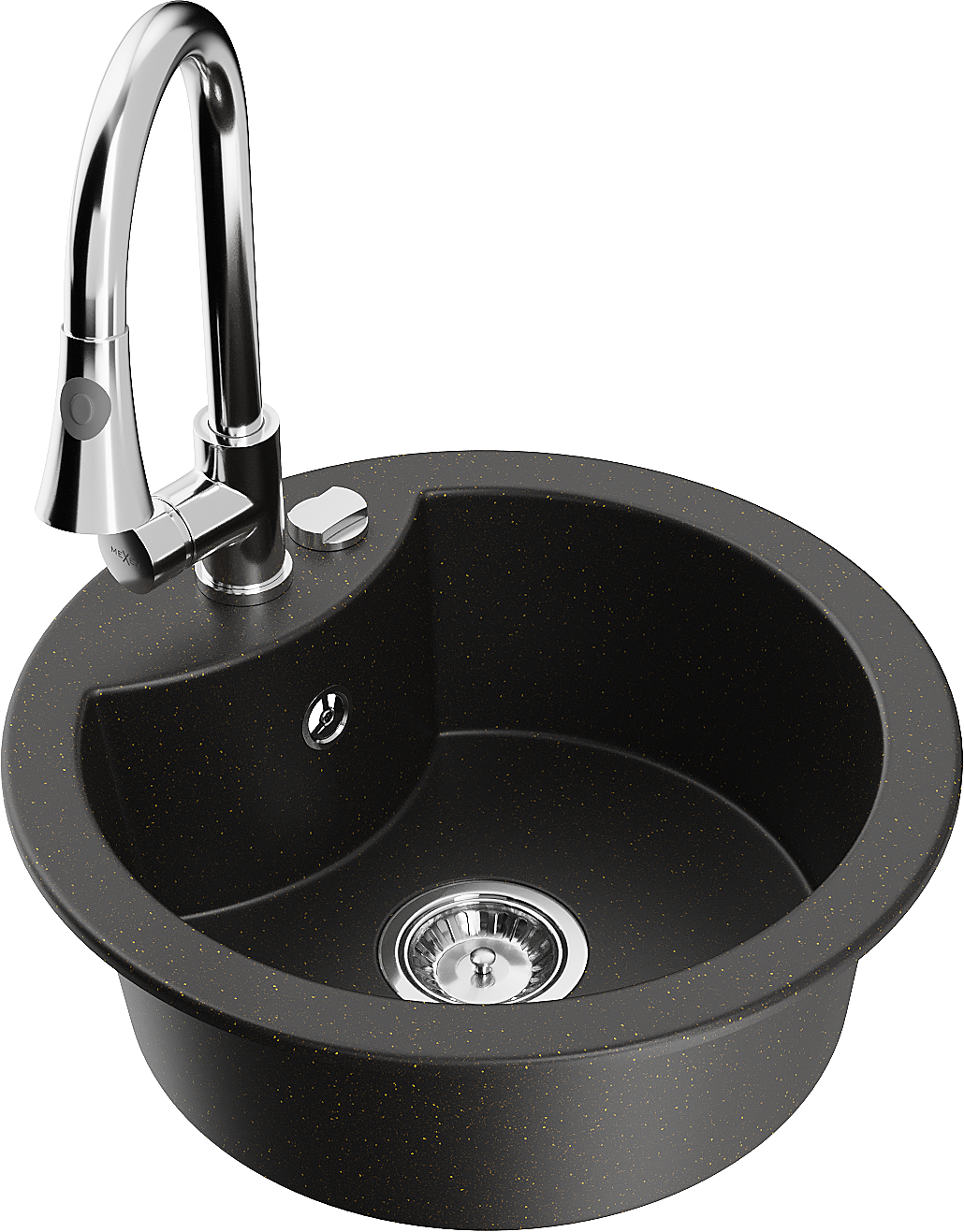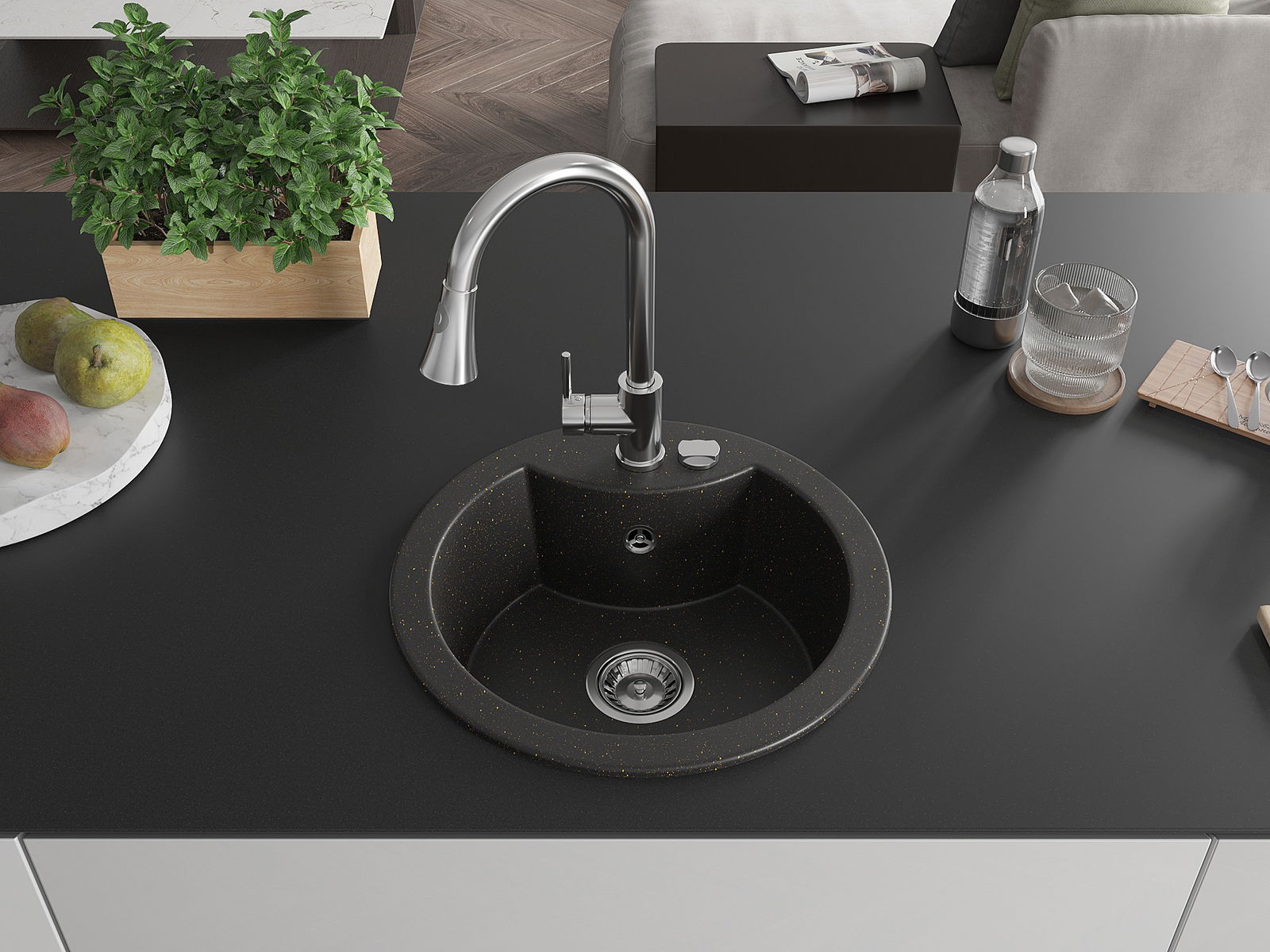 Mexen Diego granitový drez 1-komorový s kuchynskou batériou Elia, čierny/zlatý metalik - 6512-75-670101-00