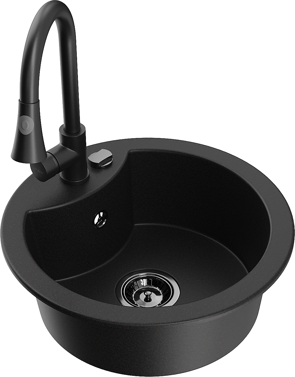 Mexen Diego jednokomorový žulový drez s kuchynskou batériou Elia, čierny - 6512-77-670101-70-B