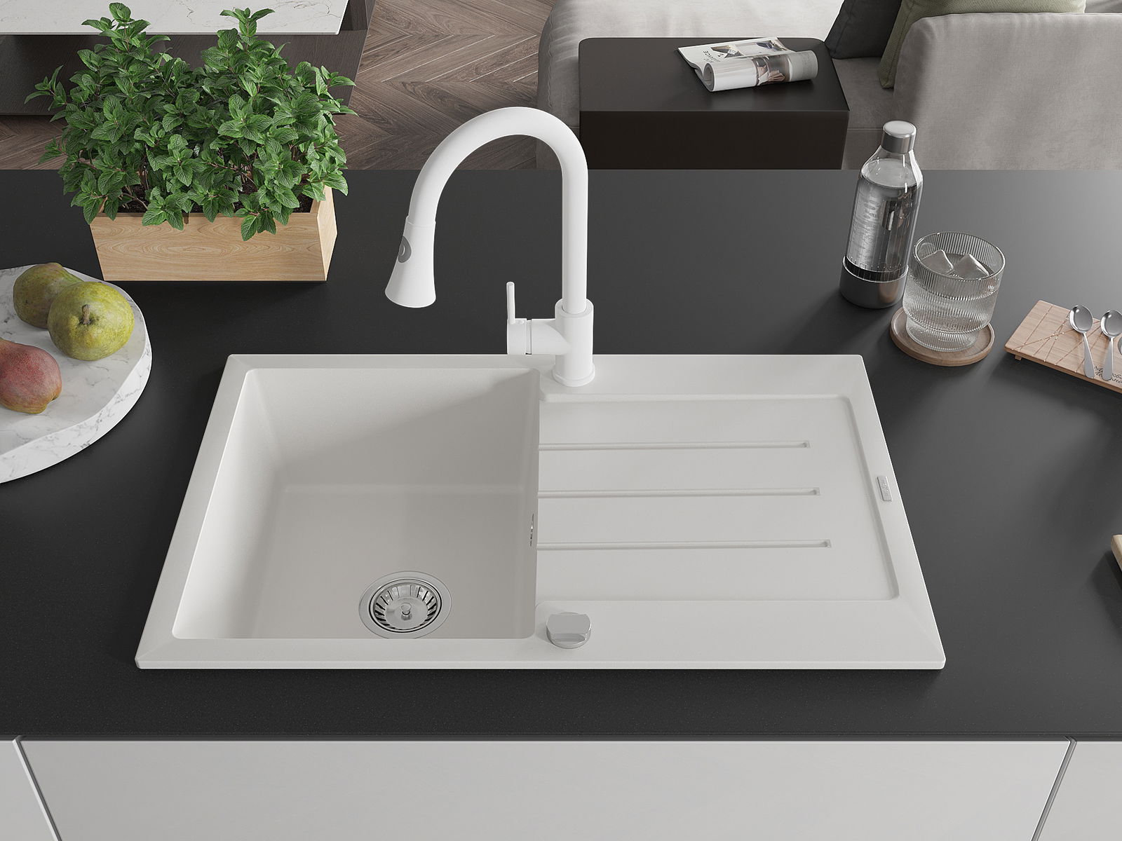 Povrch umývadla je odolný voči škvrnám a sfarbeniu, vďaka čomu sa ľahko čistí a zachováva si svoju farbu po dlhú dobu. Estetický a prakticky dopĺňajúci každú kuchyňu.