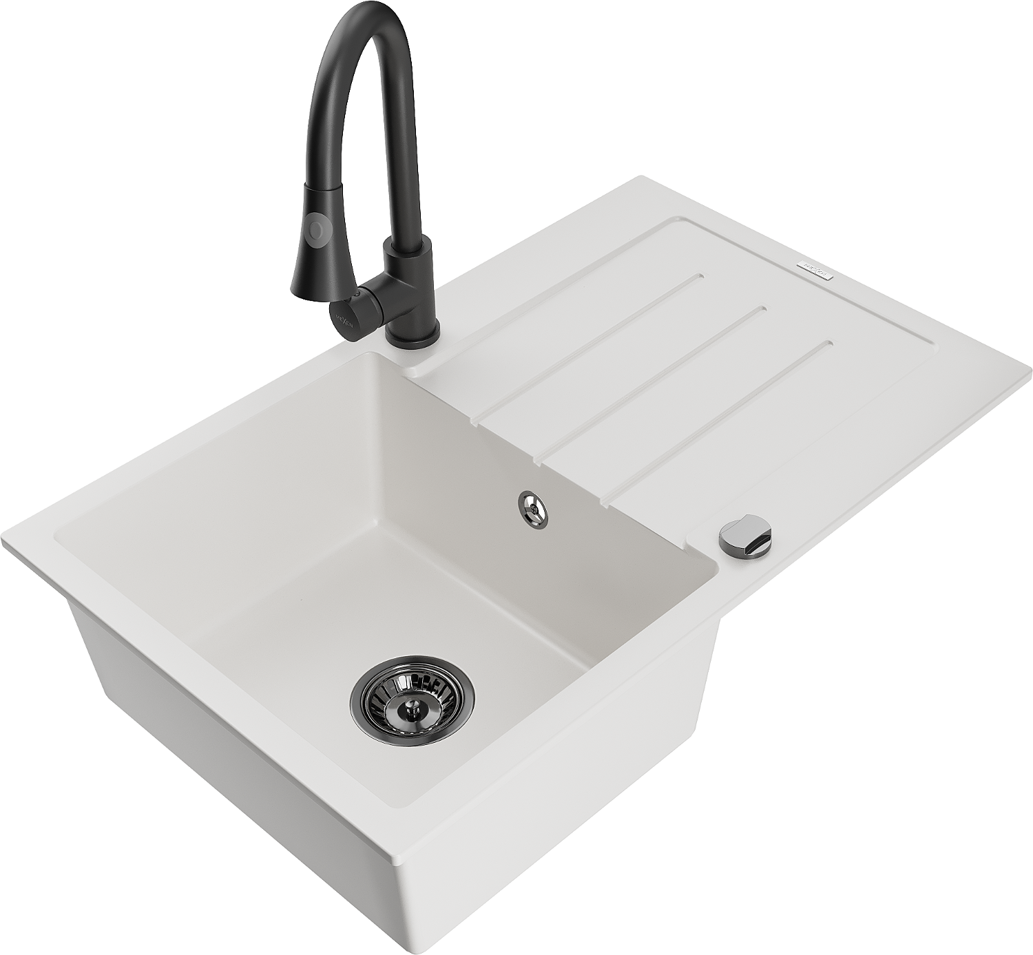 Mexen Bruno jednokomorový žulový drez s odkvapkávačom a kuchynskou batériou Elia, biely - 6513-20-670101-70
