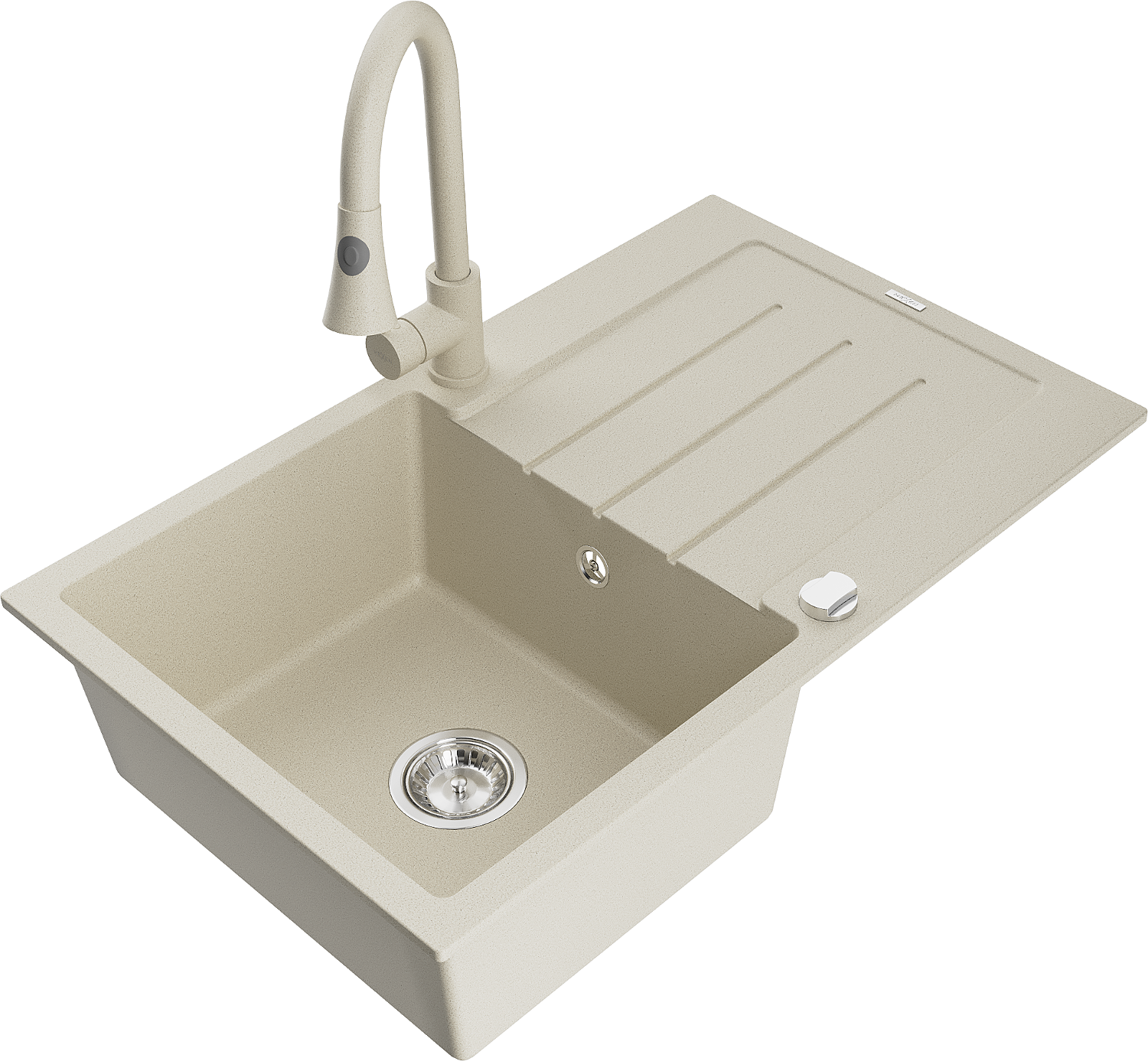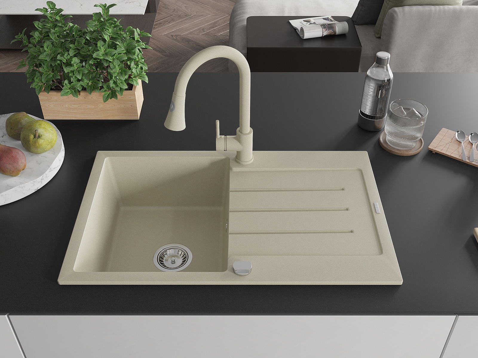 Mexen Bruno žulový drez s 1-komorou s odkvapkávačom a kuchynskou batériou Elia, béžový - 6513-69-670101-69