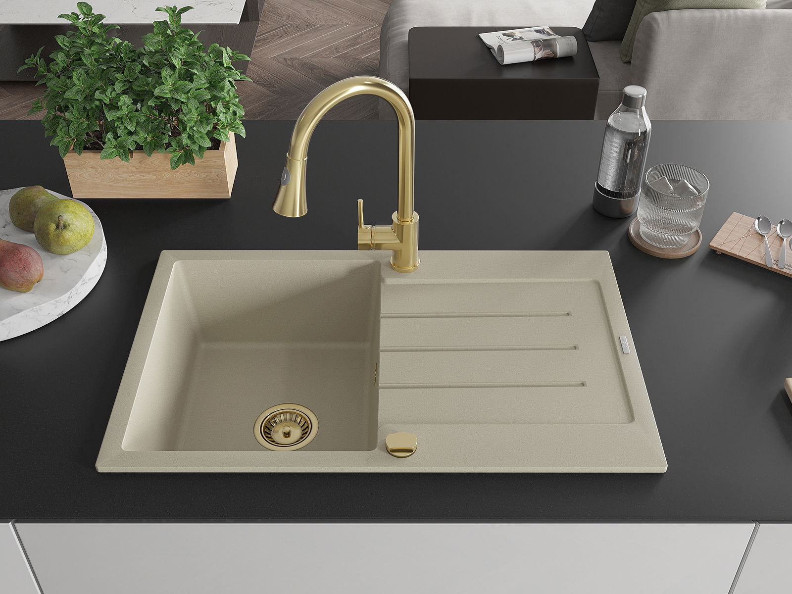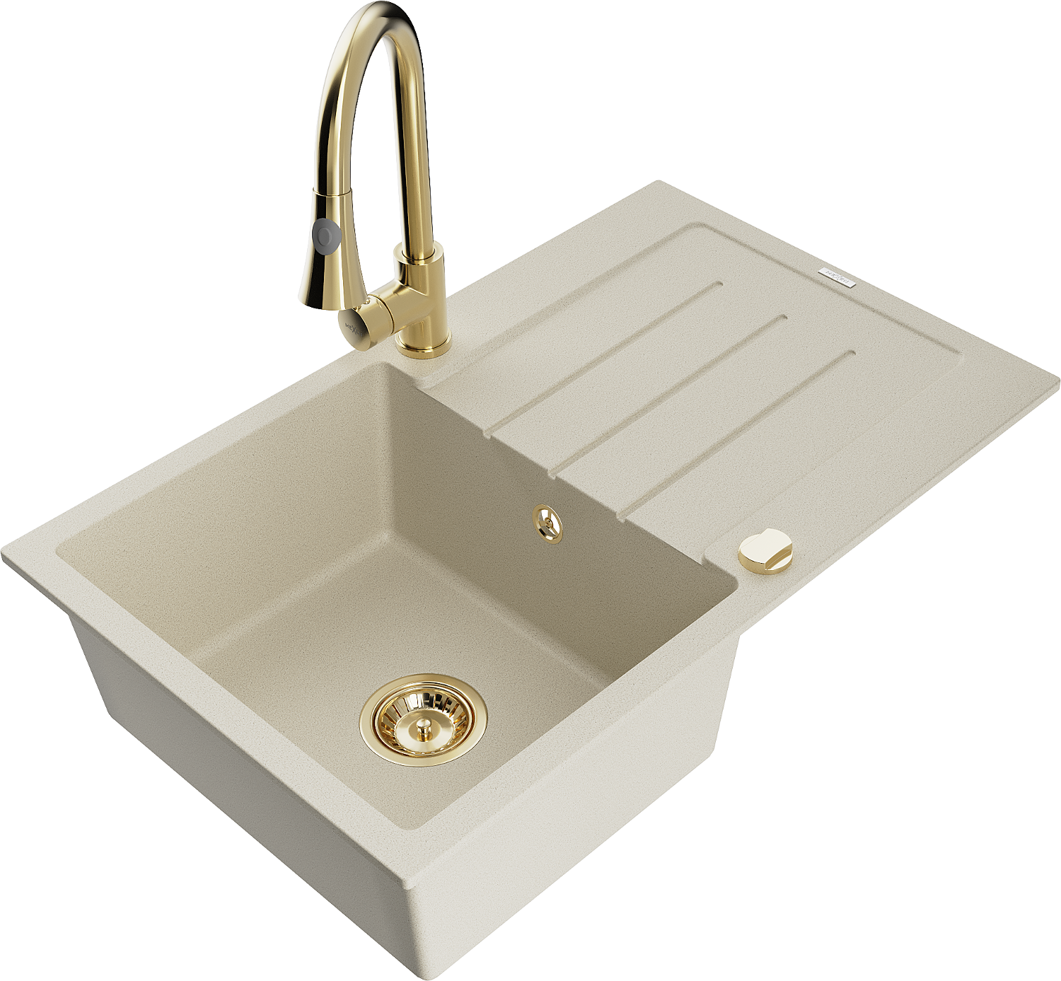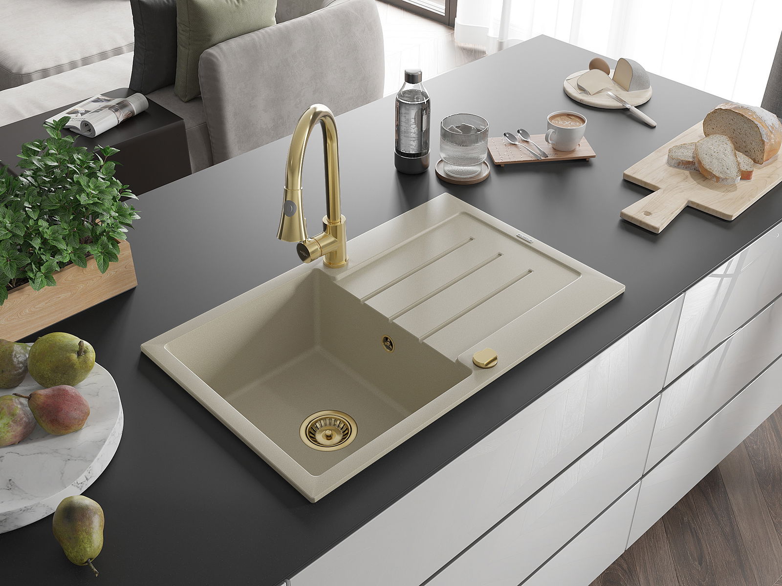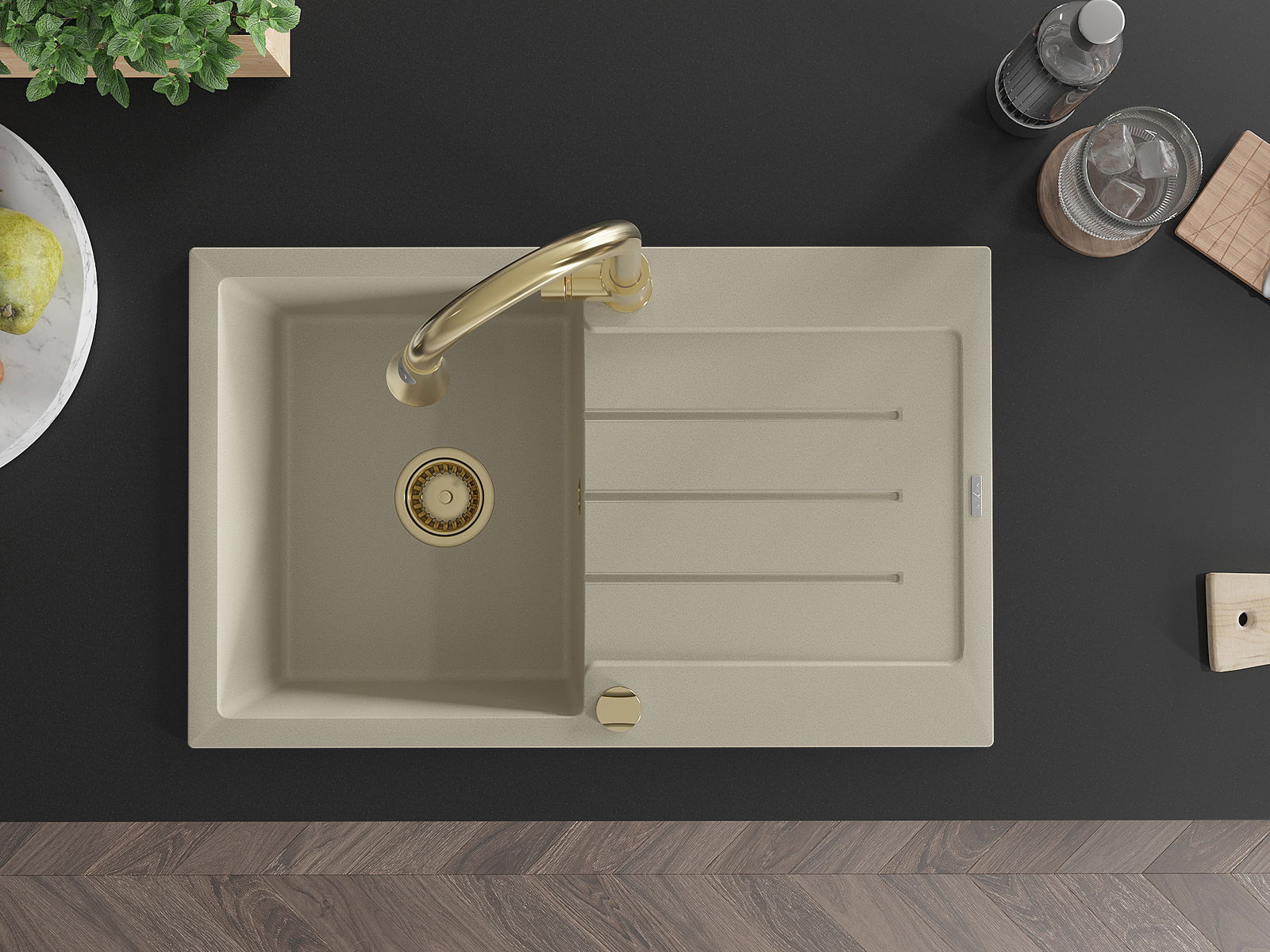 Mexen Bruno žulový kuchynský drez s 1 komorou, odkvapkávačom a kuchynskou batériou Elia, béžový - 6513-69-670101-50