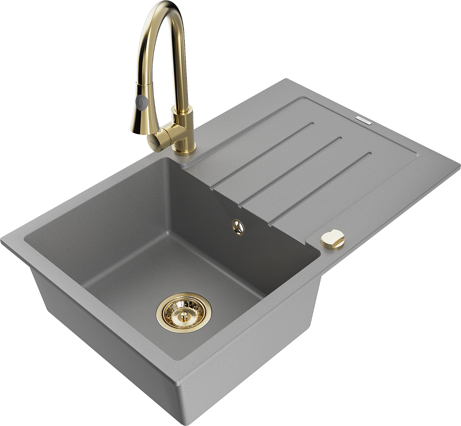Mexen Bruno granitový drez 1-komorový s odkvapkávačom a kuchynskou batériou Elia, sivý - 6513-71-670101-50
