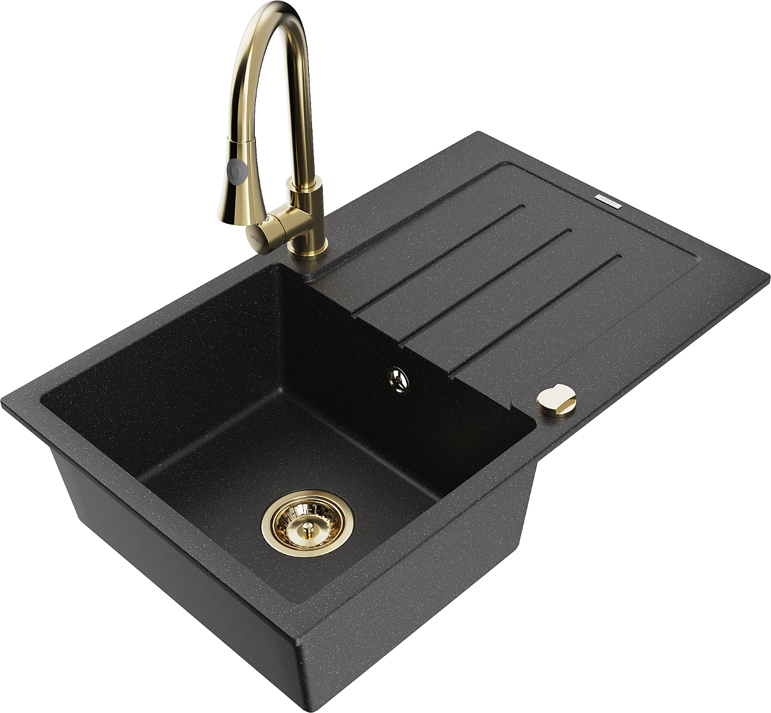 Mexen Bruno žulový drez s 1-komorou a odkvapkávačom a kuchynskou batériou Elia, čierny/strieborný metalik - 6513-73-670101-50