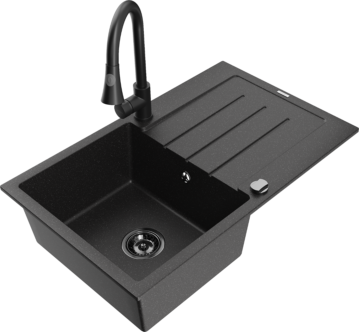 Mexen Bruno granitový drez s 1 komorou s odkvapkávacou plochou a kuchynskou batériou Elia, čierny/strieborný metalický