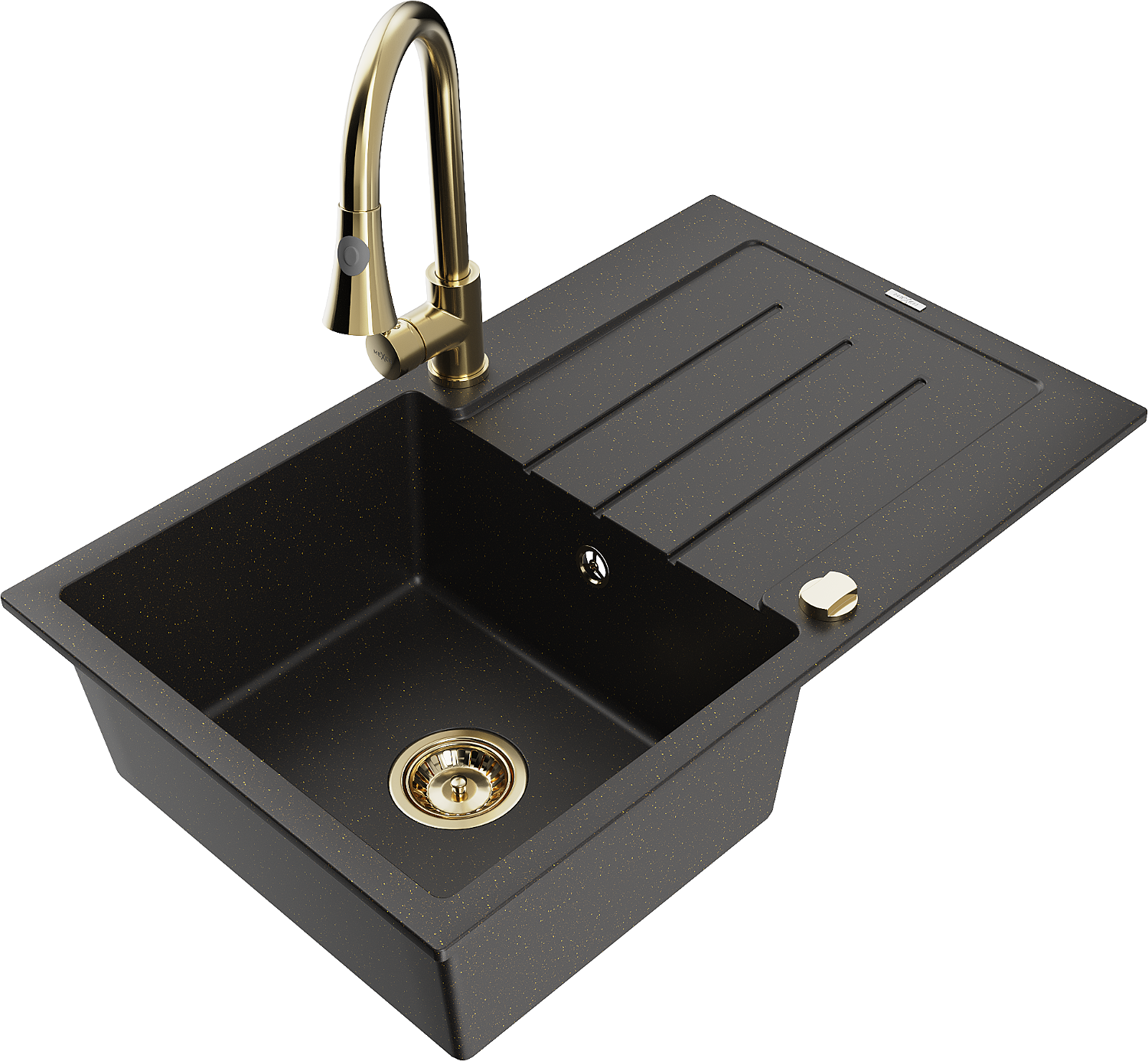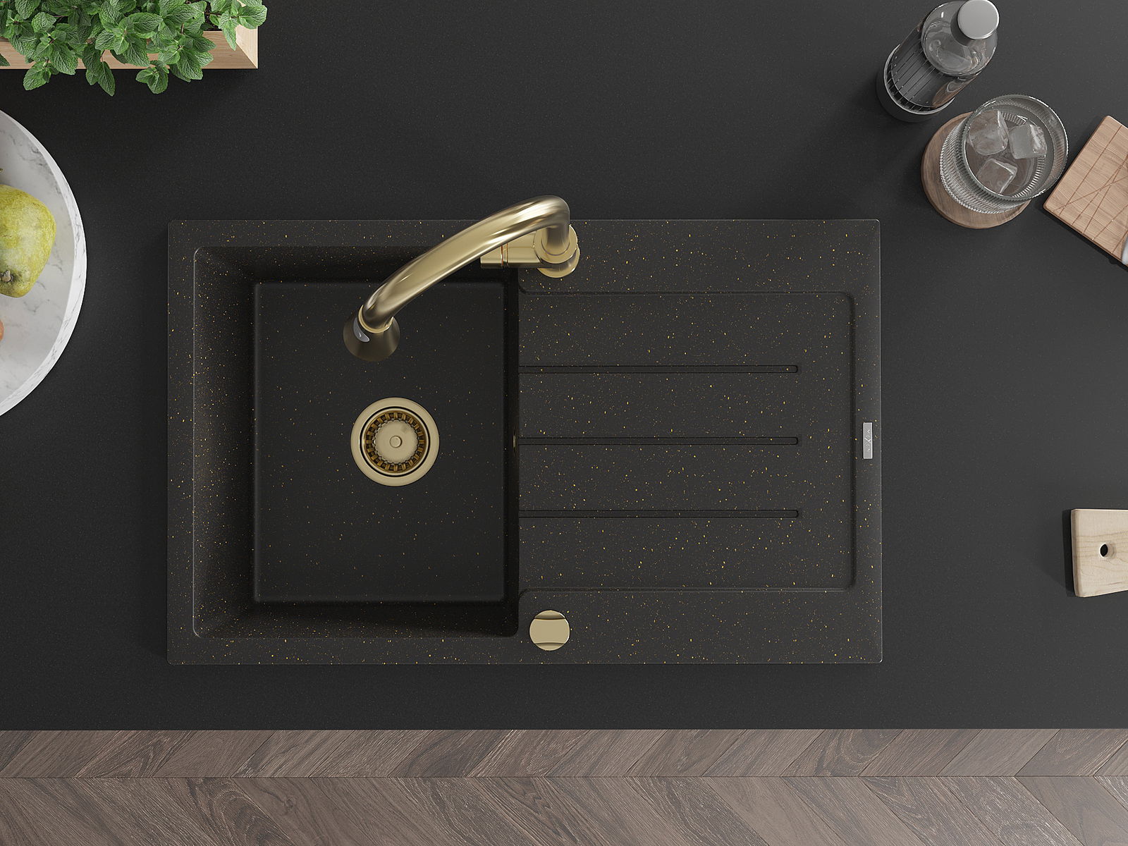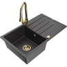 Mexen Bruno granitový drez s 1 komorou s odkapávačem a kuchynskou batériou Elia, čierny/zlatý metalický