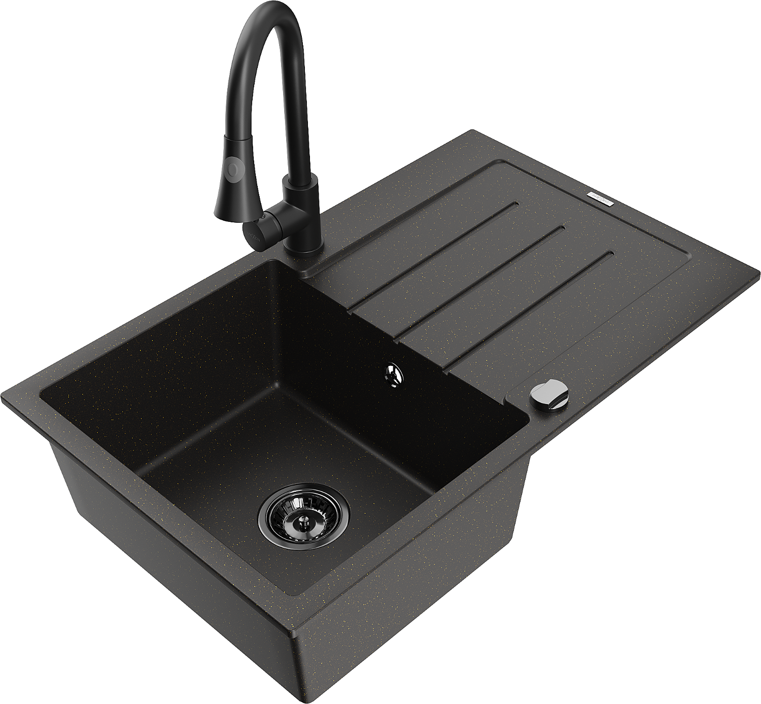 Mexen Bruno granitový drez 1-komorový s odkvapkávačom a kuchynskou batériou Elia, čierno/zlatý metalik - 6513-75-670101-70-B