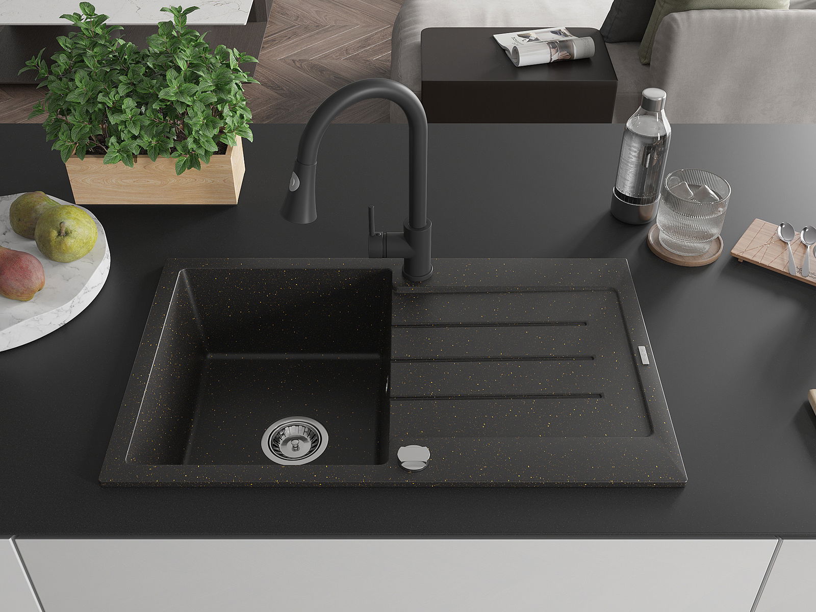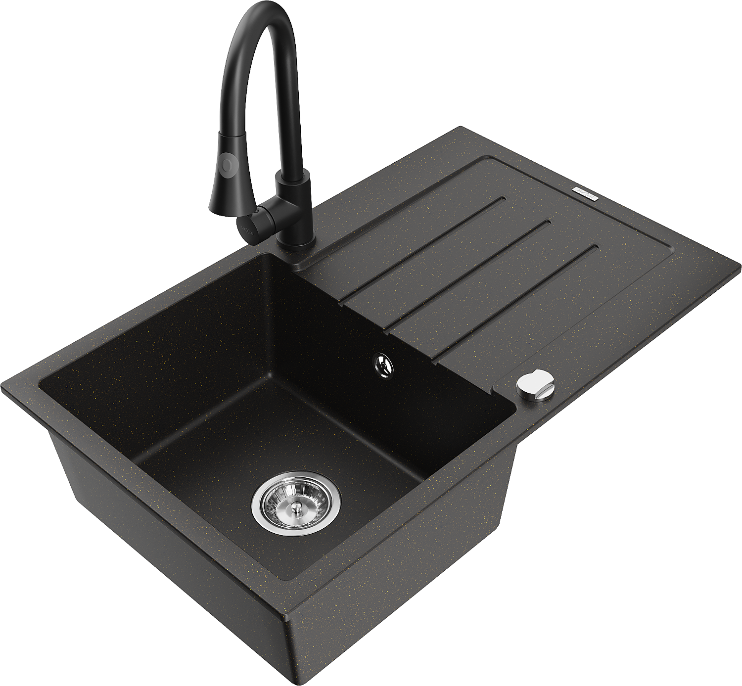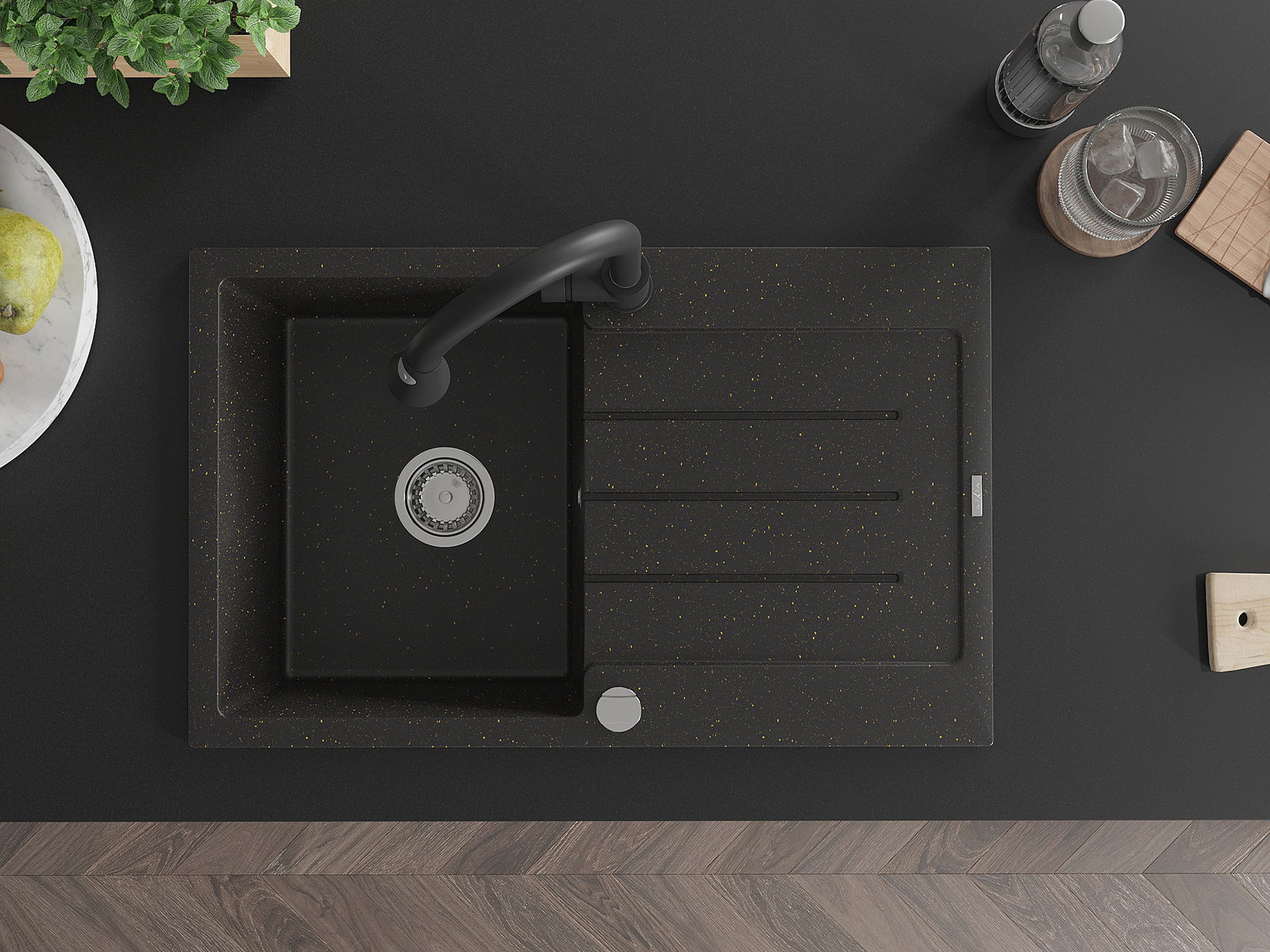 Mexen Bruno Granitový kuchynský drez s 1 komorou a odkapávačom a kuchynskou batériou Elia, čierny/zlatý metalik