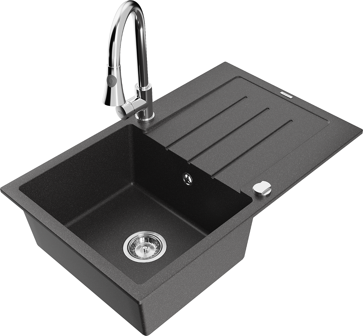 Mexen Bruno žulový drez 1-komorový s odkvapkávačom a kuchynskou batériou Elia, čierny škvrnitý - 6513-76-670101-00
